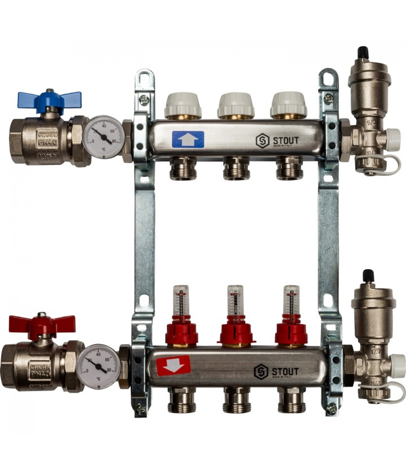 Коллектор из нержавеющей стали STOUT в сборе с расходомерами 3 вых.