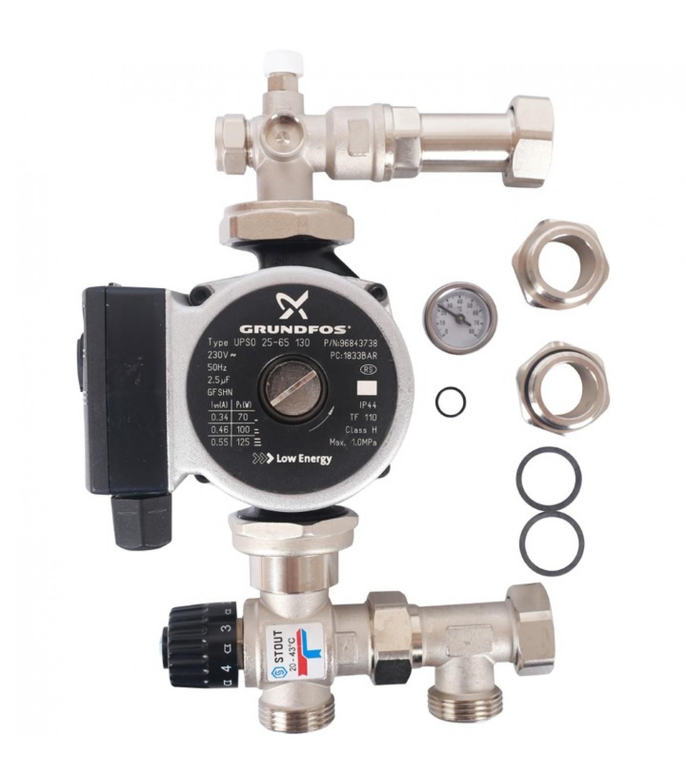 Насосно-смесительный узел STOUT с термостатическим клапаном 20-43°C, с насосом UPSO 25-65, 130 mm