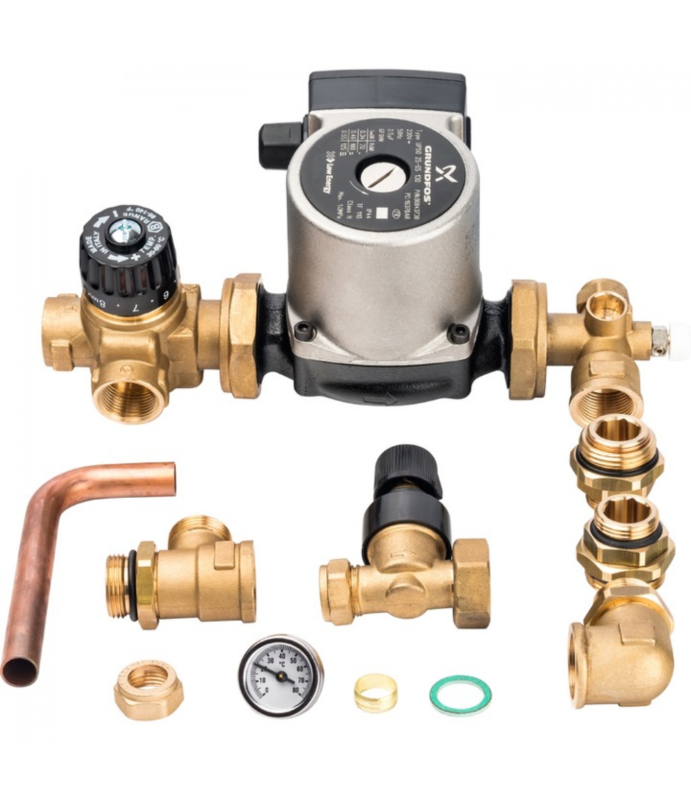 Насосно-смесительный узел STOUT с термостатическим клапаном и байпасом; Grundfos UPSO 25-65 130