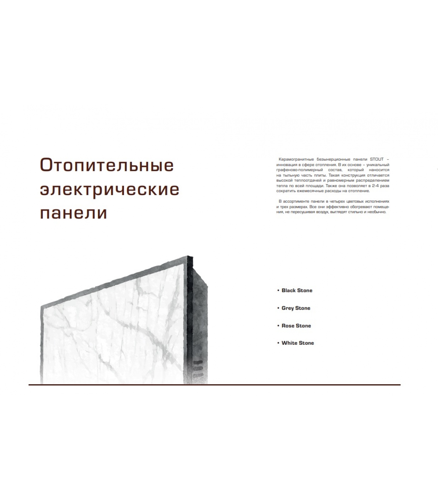 Керамогранитные безынерционные панели STOUT – инновация в сфере отопления. В их основе – уникальный графеново-полимерный состав, который наносится на тыльную часть плиты. Такая конструкция отличается высокой теплоотдачей и равномерным распределением тепла по всей площади. Также она позволяет в 2-4 раза сократить ежемесячные расходы на отопление.