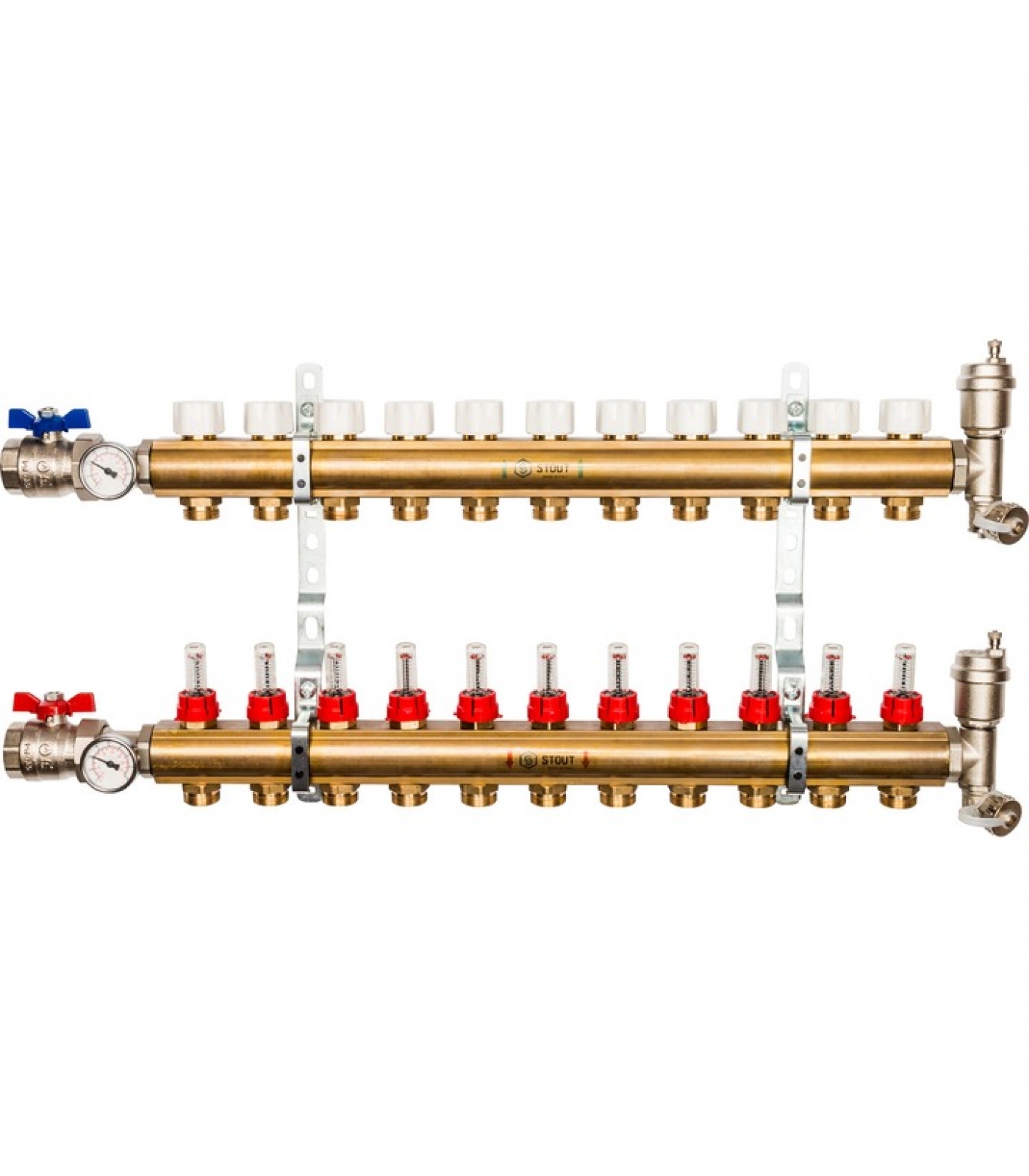 Распределительный коллектор STOUT из латуни с расходомерами 11 вых.