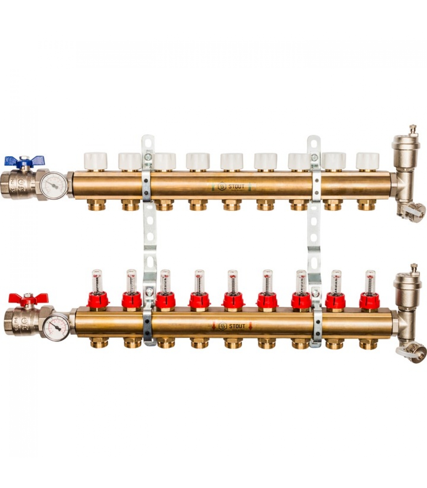 Распределительный коллектор STOUT из латуни с расходомерами 9 вых.