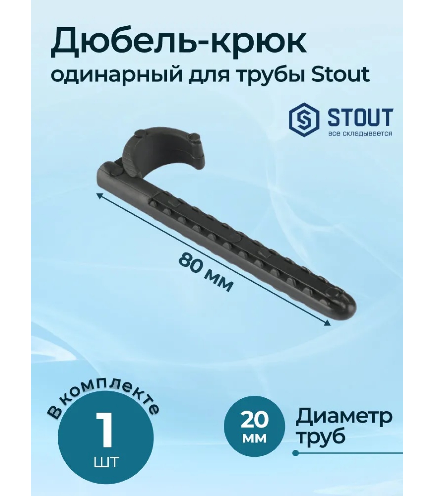Дюбель-крюк одинарный для трубы Stout 20 мм разработан и изготовлен для крепления труб к твердым поверхностям во время установки настенного и напольного отопления.