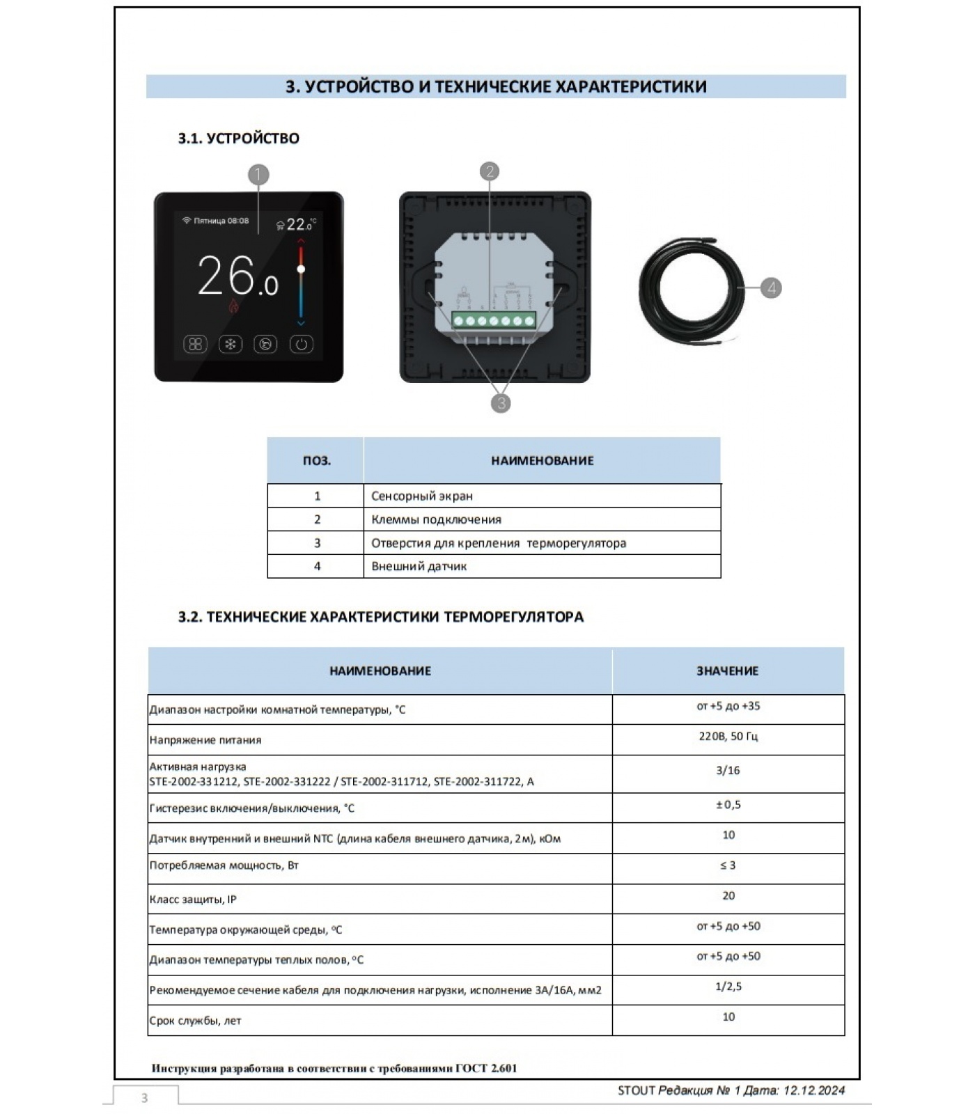 Комнатные терморегуляторы с цветным сенсорным экраном STE-2002 STOUT предназначены для управления электрическими нагревательными приборами, электротермическими исполнительными механизмами или иными устройствами с питанием 230В (не превышающими коммутирующую мощность терморегулятора). При этом терморегуляторы STE-2002-331222, STE2002-331212 также могут управлять различными устройствами через беспотенциальный контакт (например: котлом, емкостным водонагревателем или иным устройством). Терморегулятор поддерживает заданную температуру в помещении путем подачи напряжения на силовые клеммы или путем замыкания/размыкания беспотенциальных контактов.