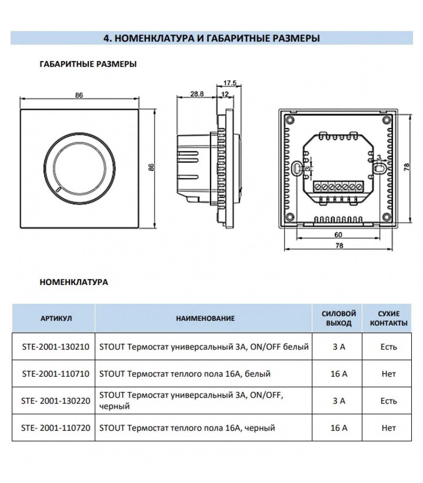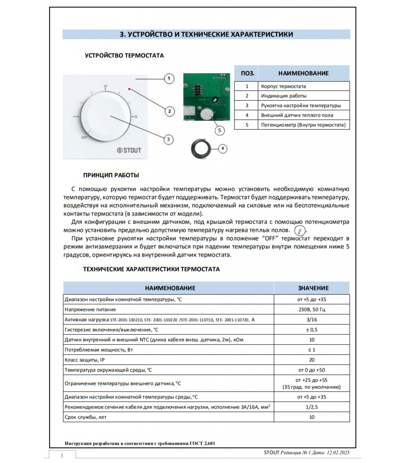 Комнатные термостаты STE-2001 STOUT предназначены для управления электрическими нагревательными приборами, электротермическими исполнительными механизмами или иными устройствами с питанием 230В (не превышающими коммутирующую мощность термостата), а также на моделях STE-2001-130210, STE-2001-130220 есть возможность управления устройствами через беспотенциальный контакт (например: котлом, или иным устройством). Термостаты поддерживают заданную температуру в помещении путем подачи напряжения на силовые клеммы устройства или путем замыкания/размыкания беспотенциальных контактов.