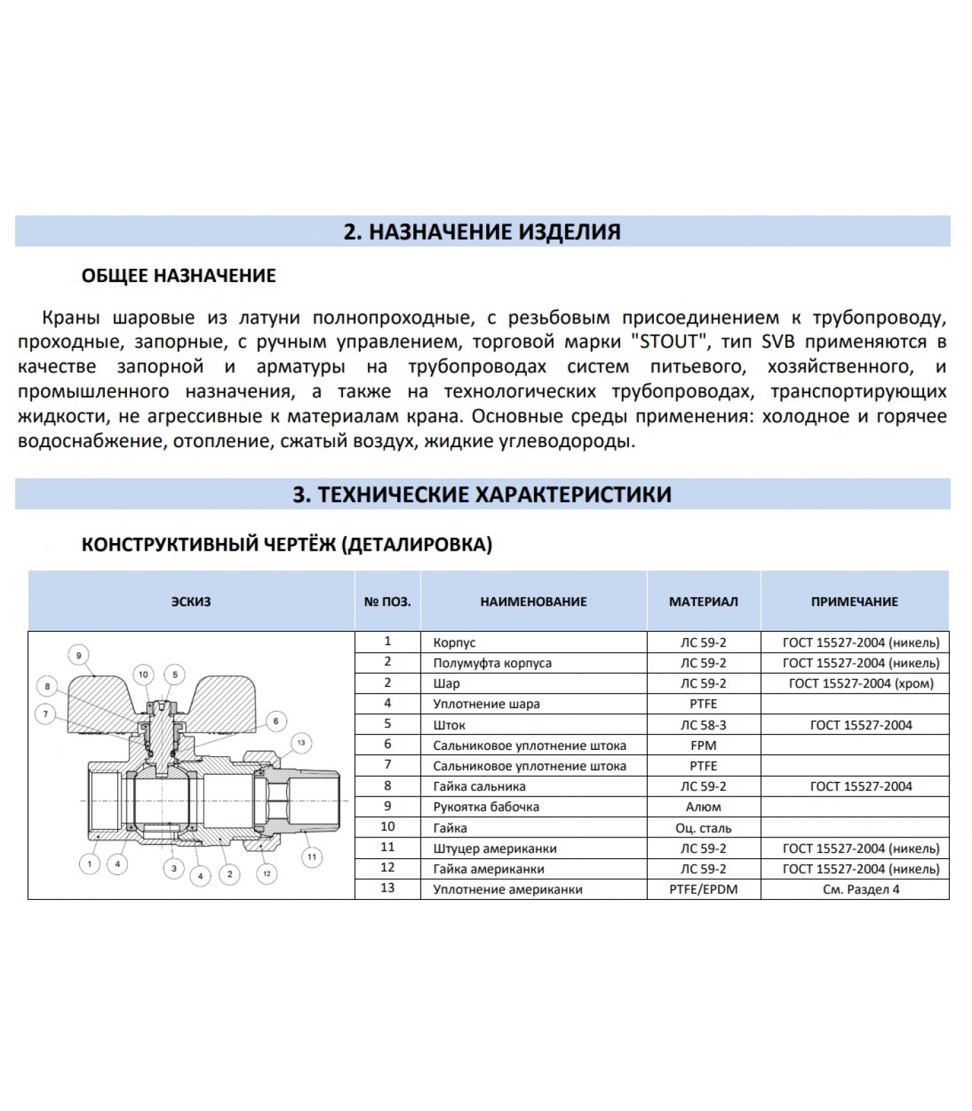 Краны шаровые из латуни полнопроходные, с резьбовым присоединением к трубопроводу, проходные, запорные, с ручным управлением, торговой марки "STOUT", тип SVВ применяются в качестве запорной и арматуры на трубопроводах систем питьевого, хозяйственного, и промышленного назначения, а также на технологических трубопроводах, транспортирующих жидкости, не агрессивные к материалам крана. Основные среды применения: холодное и горячее водоснабжение, отопление, сжатый воздух, жидкие углеводороды.