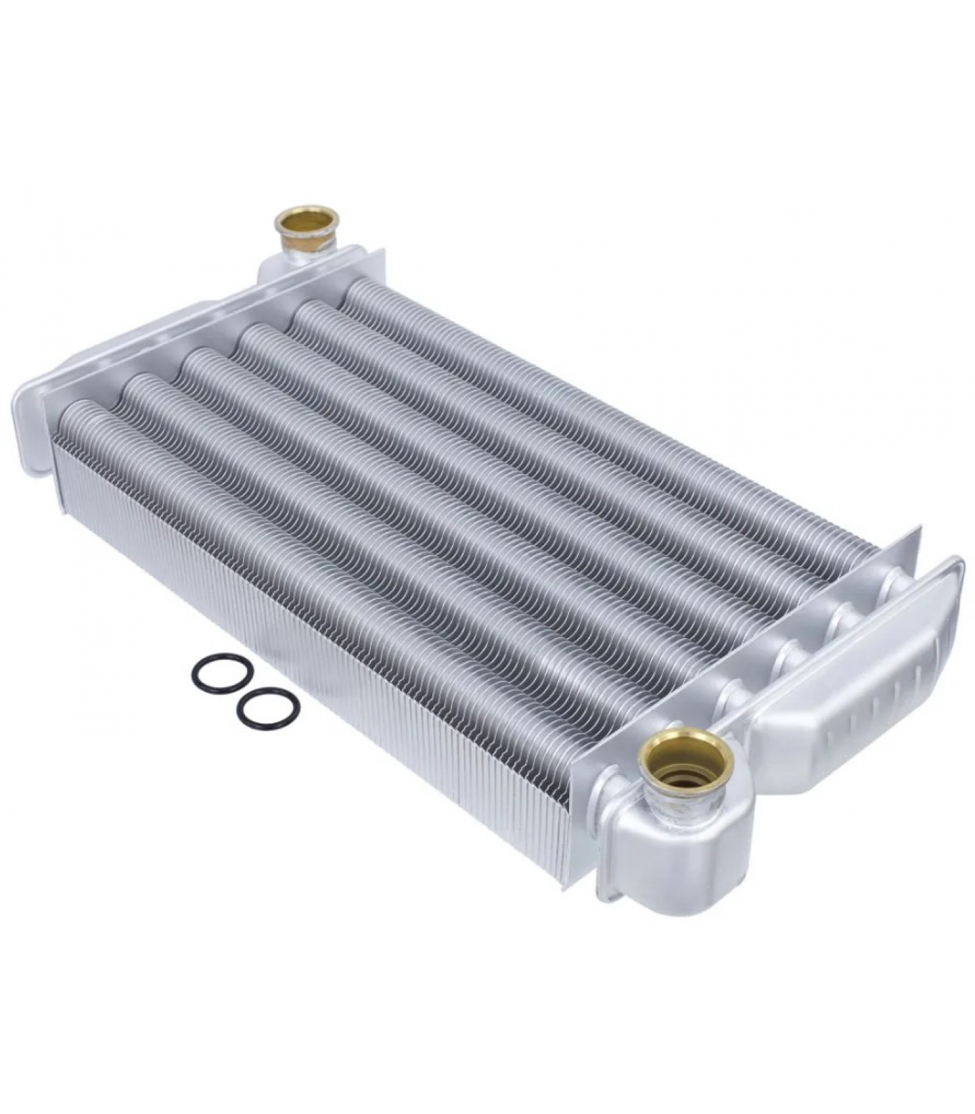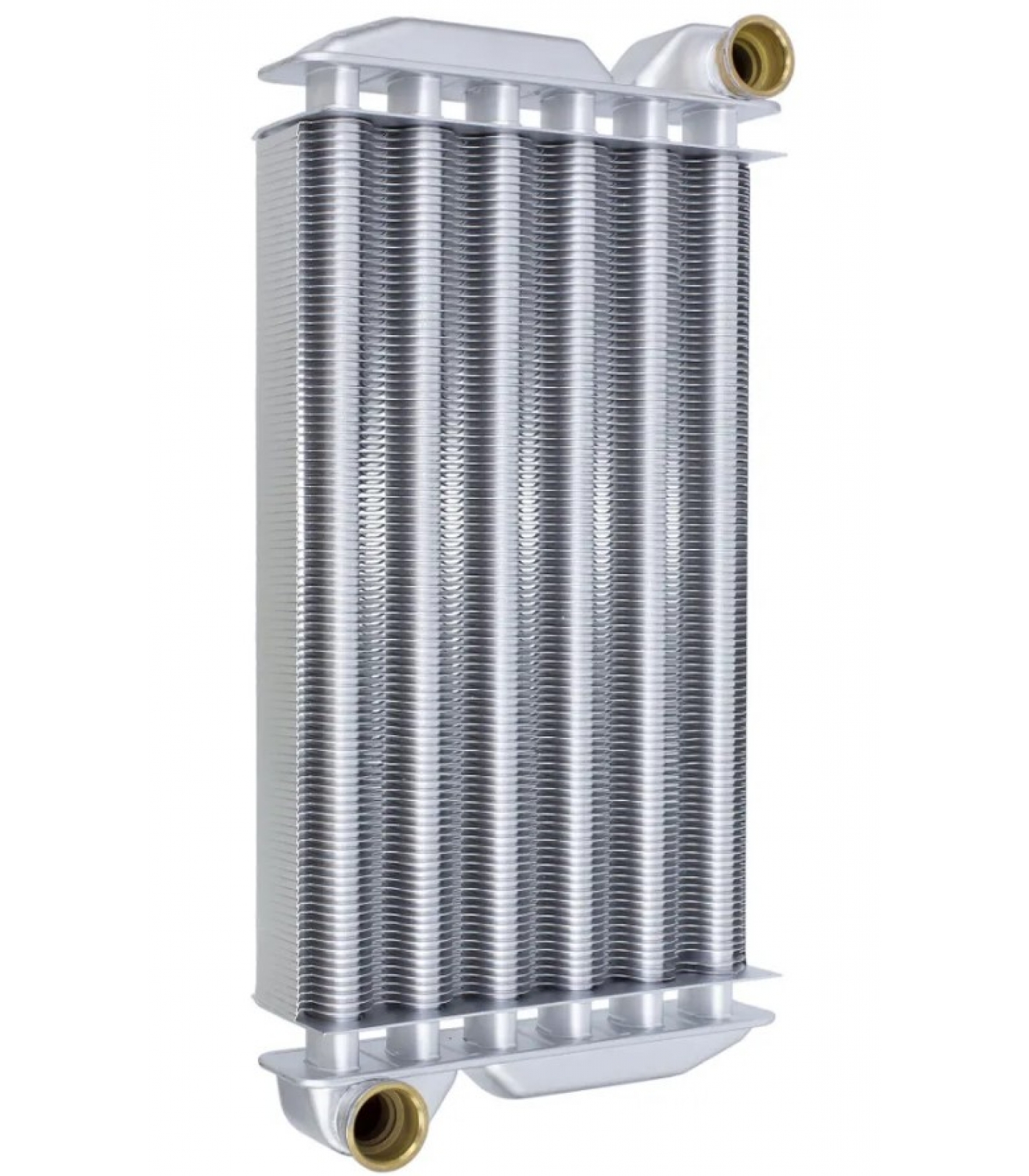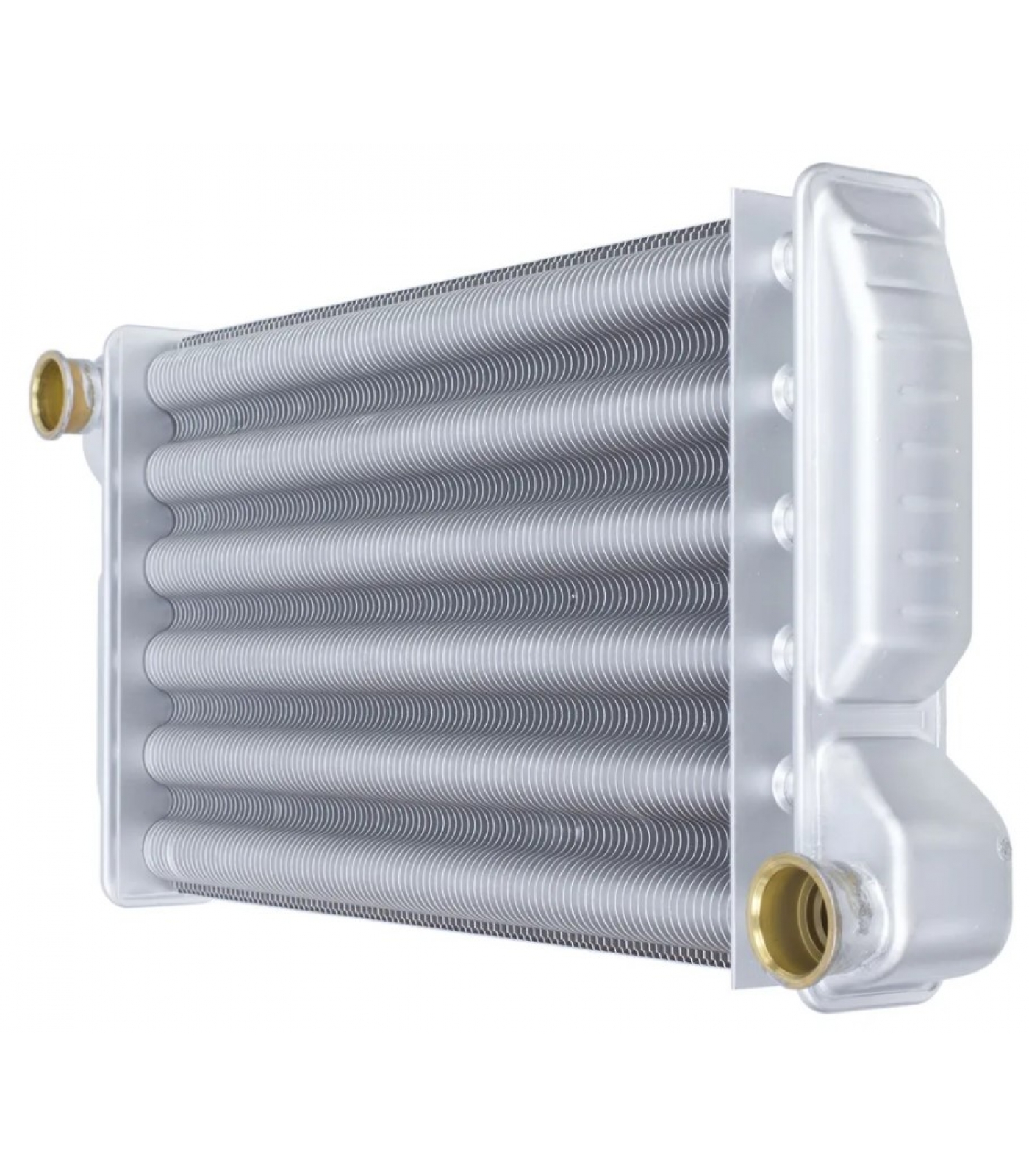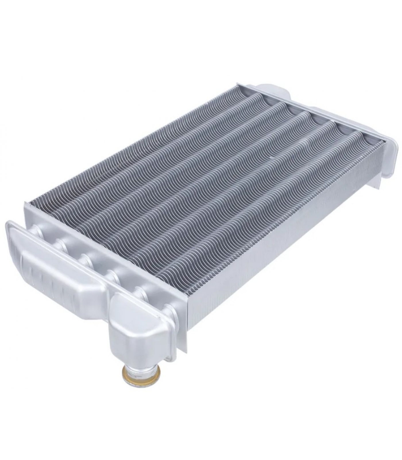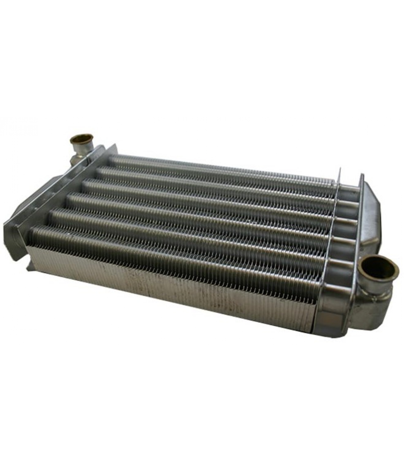 Основной теплообменник первичного контура отопления для котлов с номинальной мощностью 24 кВт. Высокая эффективность эксплуатации происходит с помощью большой поверхности теплообмена. Улучшенное распределение теплоносителя благодаря наличию внутри труб турбуляторов. Параллельное соединение между трубами уменьшает теплопотери. Теплообменник установлен внутри камеры сгорания и огражден изоляционными панелями, что обеспечивают сбережение тепла.