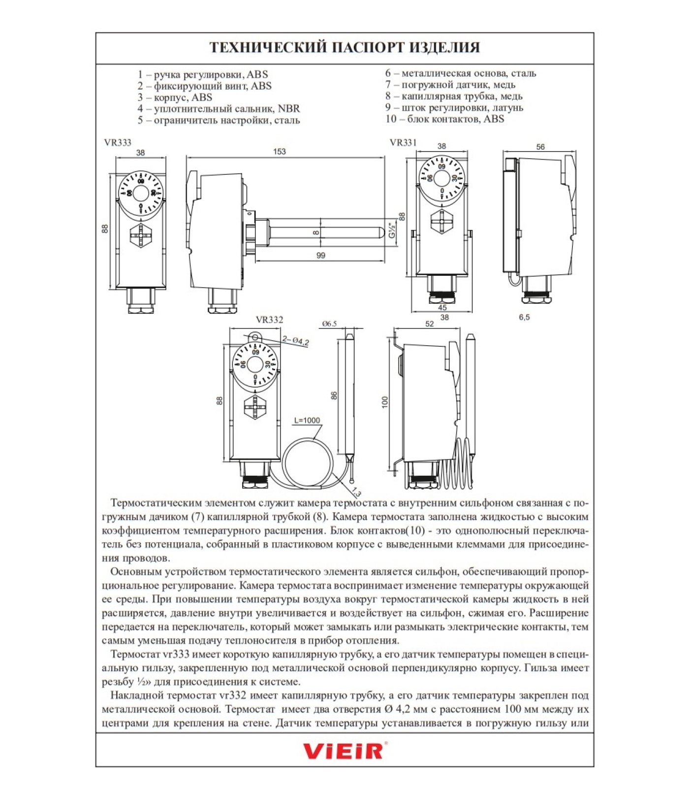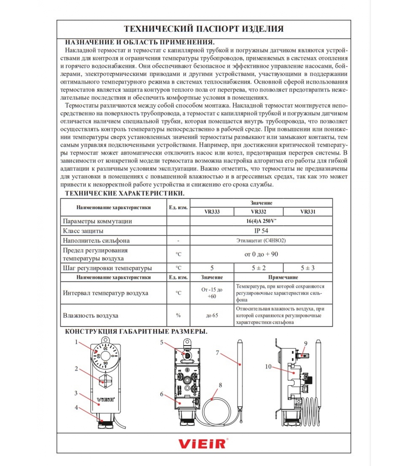 Термостат Vieir 0-90С, 220В,16А, с капиллярной трубкой