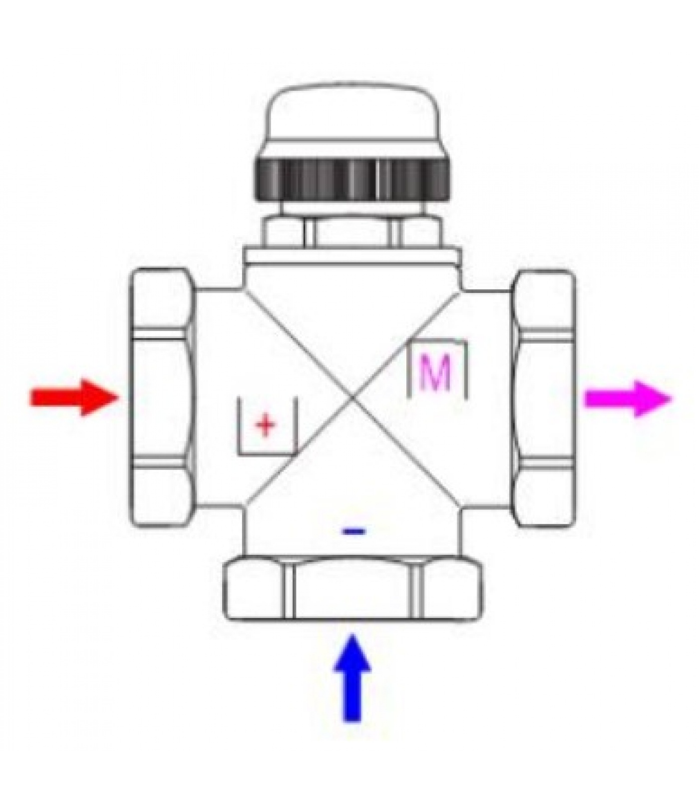 Направление потоков горячей (+), холодной (-) и смешанной (M) воды должно соответствовать обозначениям на корпусе клапана.