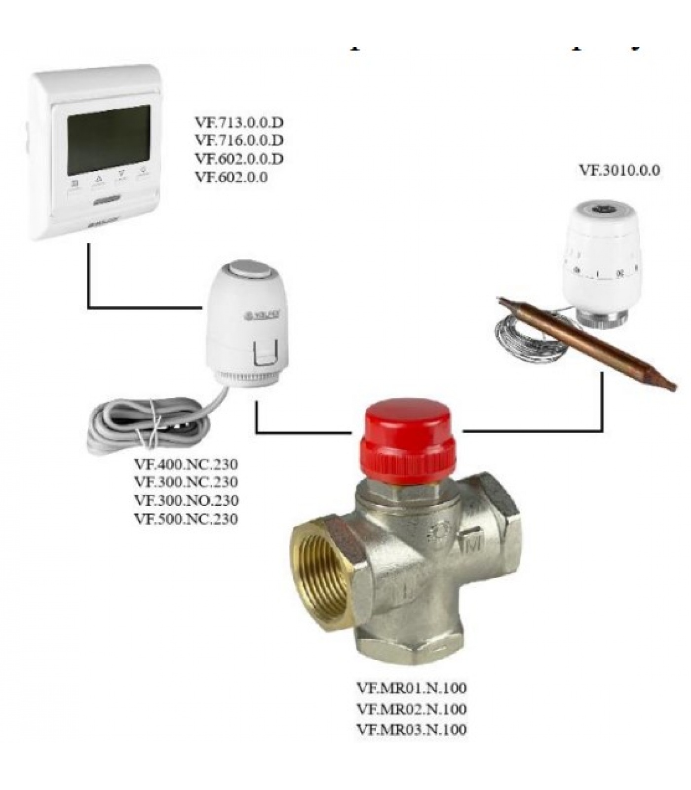 Регулирование клапаном может осуществляться как вручную с помощью защитнорегулировочного колпачка, так и посредством термоголовки М30х1,5 с выносным датчиком или аналоговым аксиальным сервоприводом, работающим под управлением контроллера. Допускается управление клапаном двухпозиционным сервоприводом, управляемым термостатом.