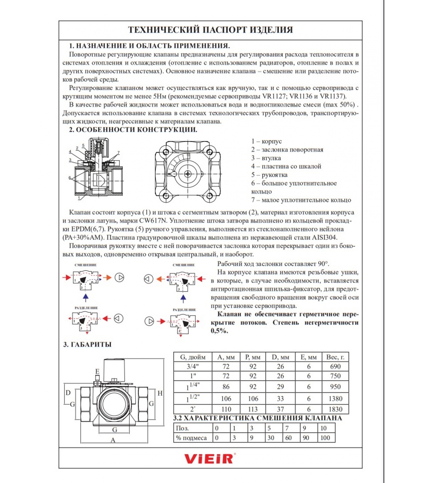 Клапан смесительный трехходовой поворотный Vieir VR176 предназначен для использования в смесительных и разделительных узлах климатических систем для распределения потоков жидкости.
