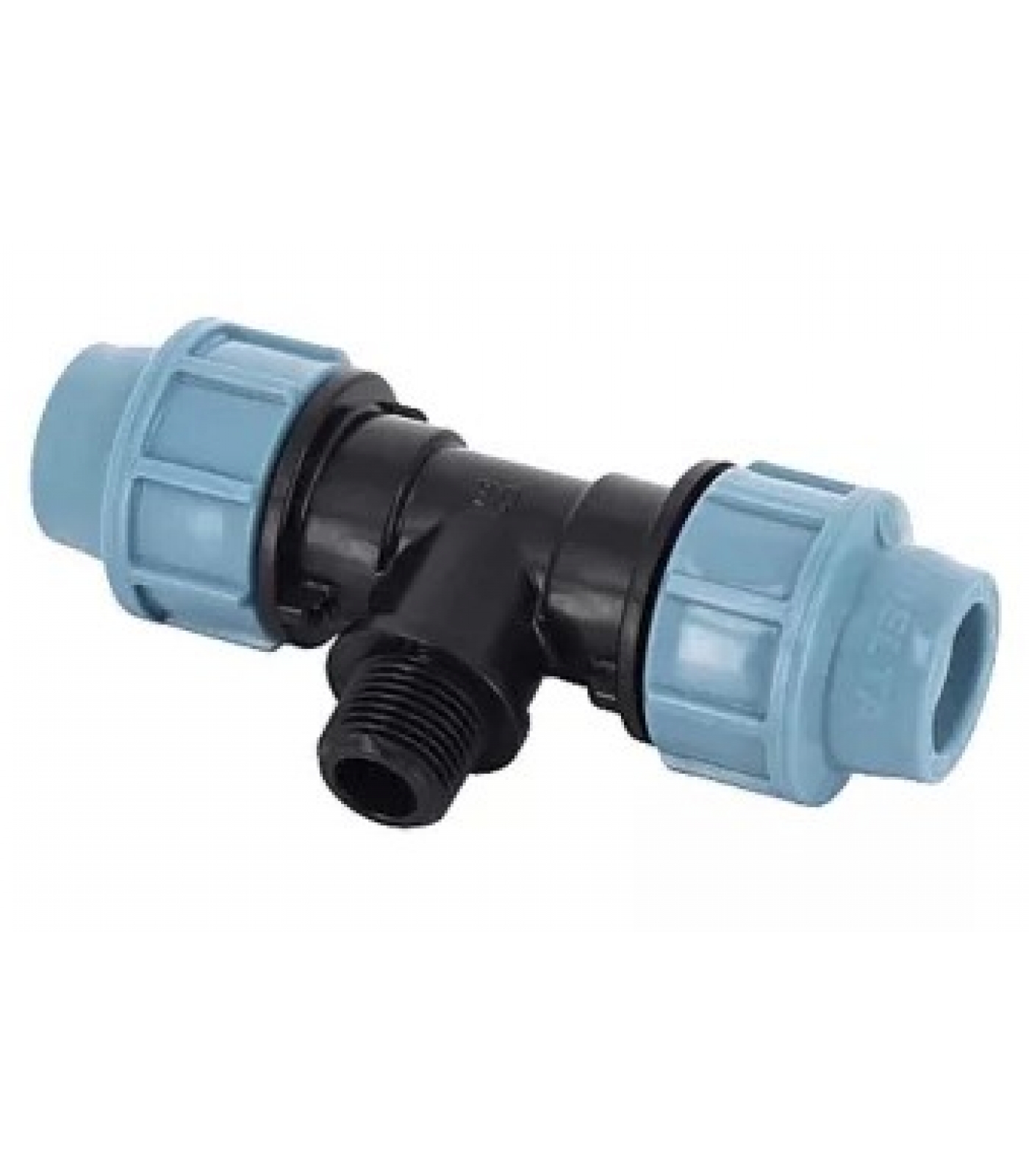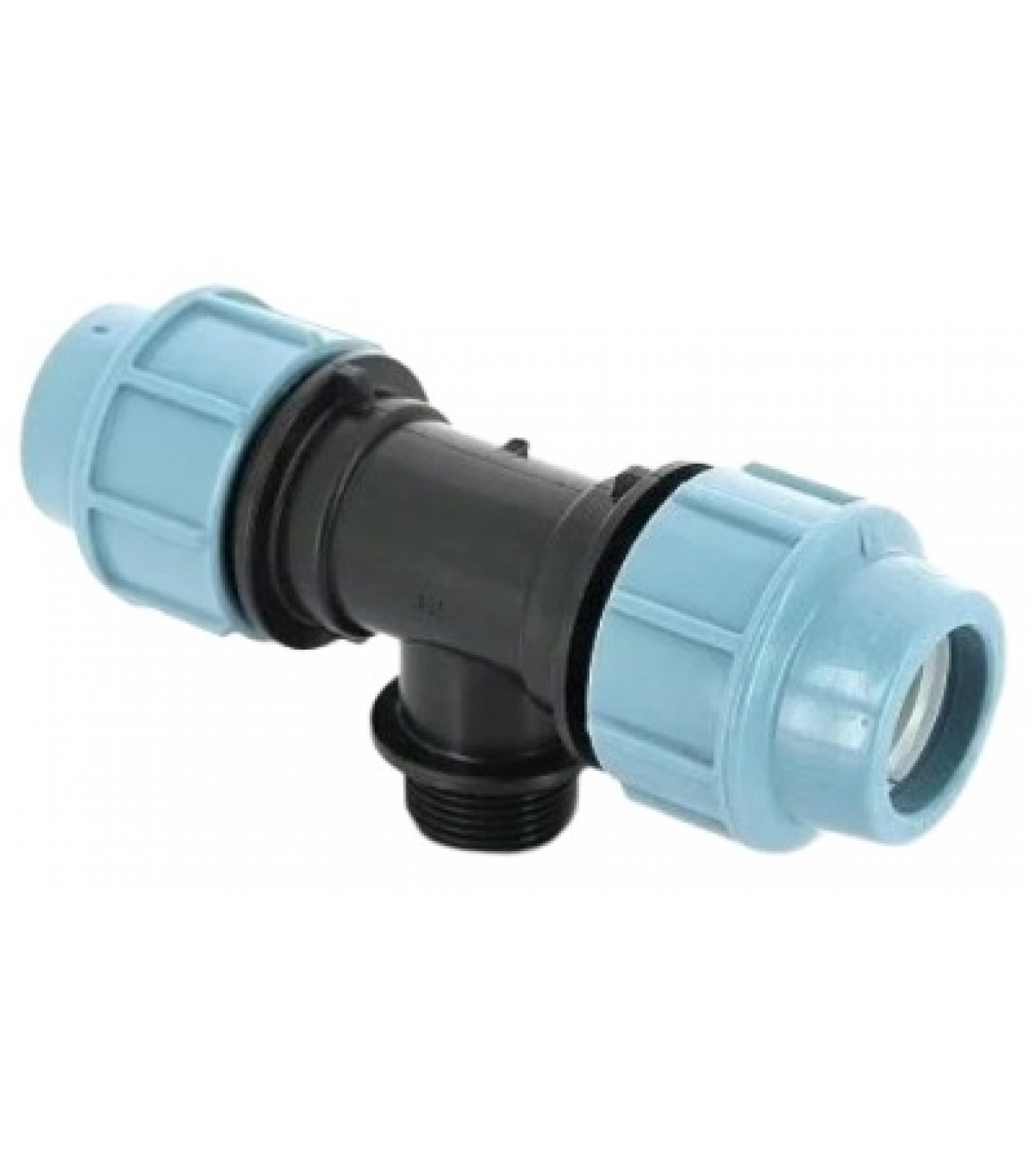 Тройник Unidelta компрессионный 25 мм х 1/2"наружная резьба х 25 мм, предназначен для обеспечения надежного соединения магистрали полиэтиленовой трубы равного диаметра с ответвлением под прямым углом на элемент с резьбовым соединением.