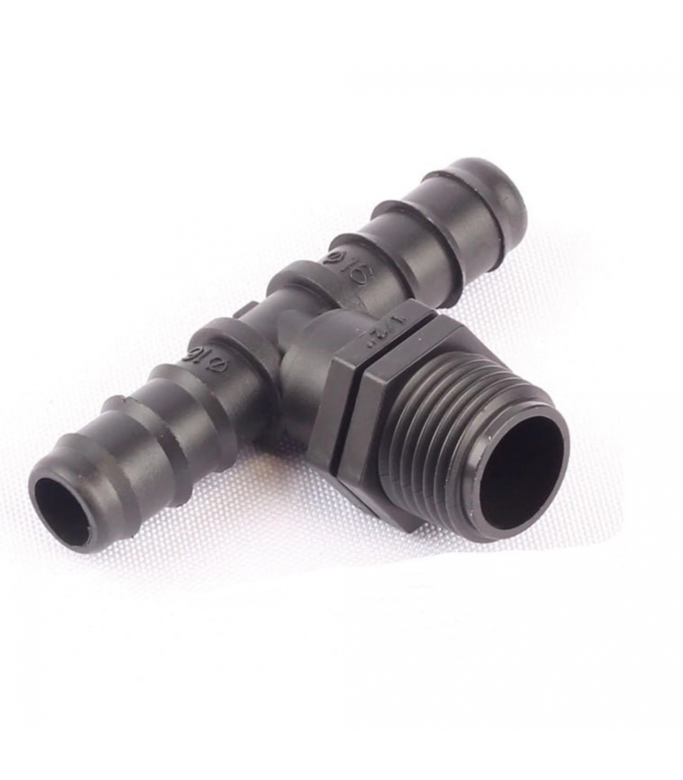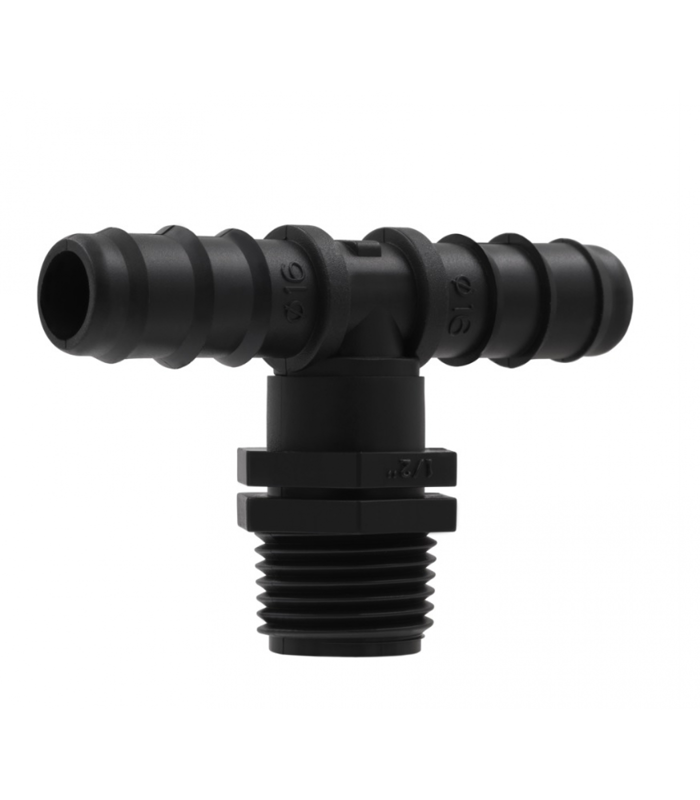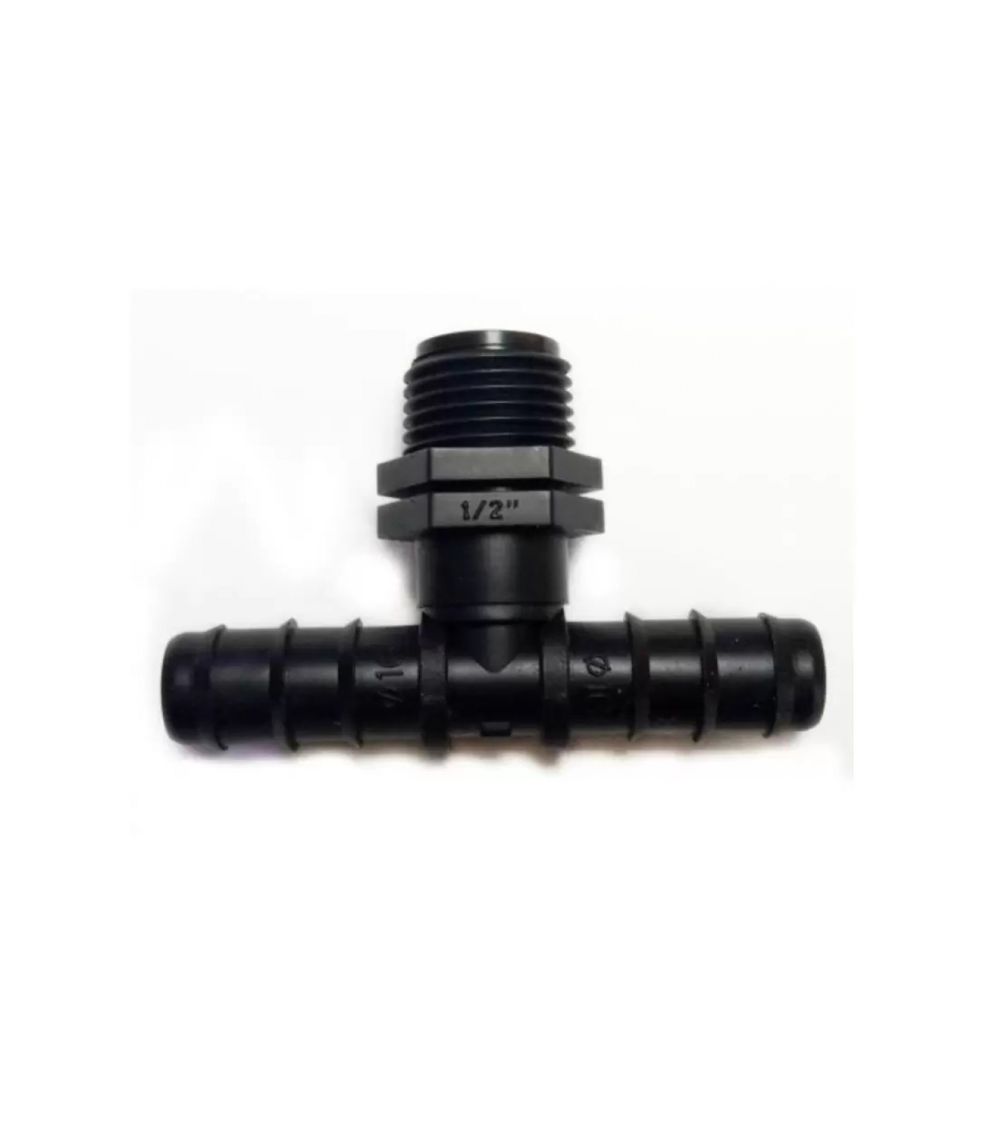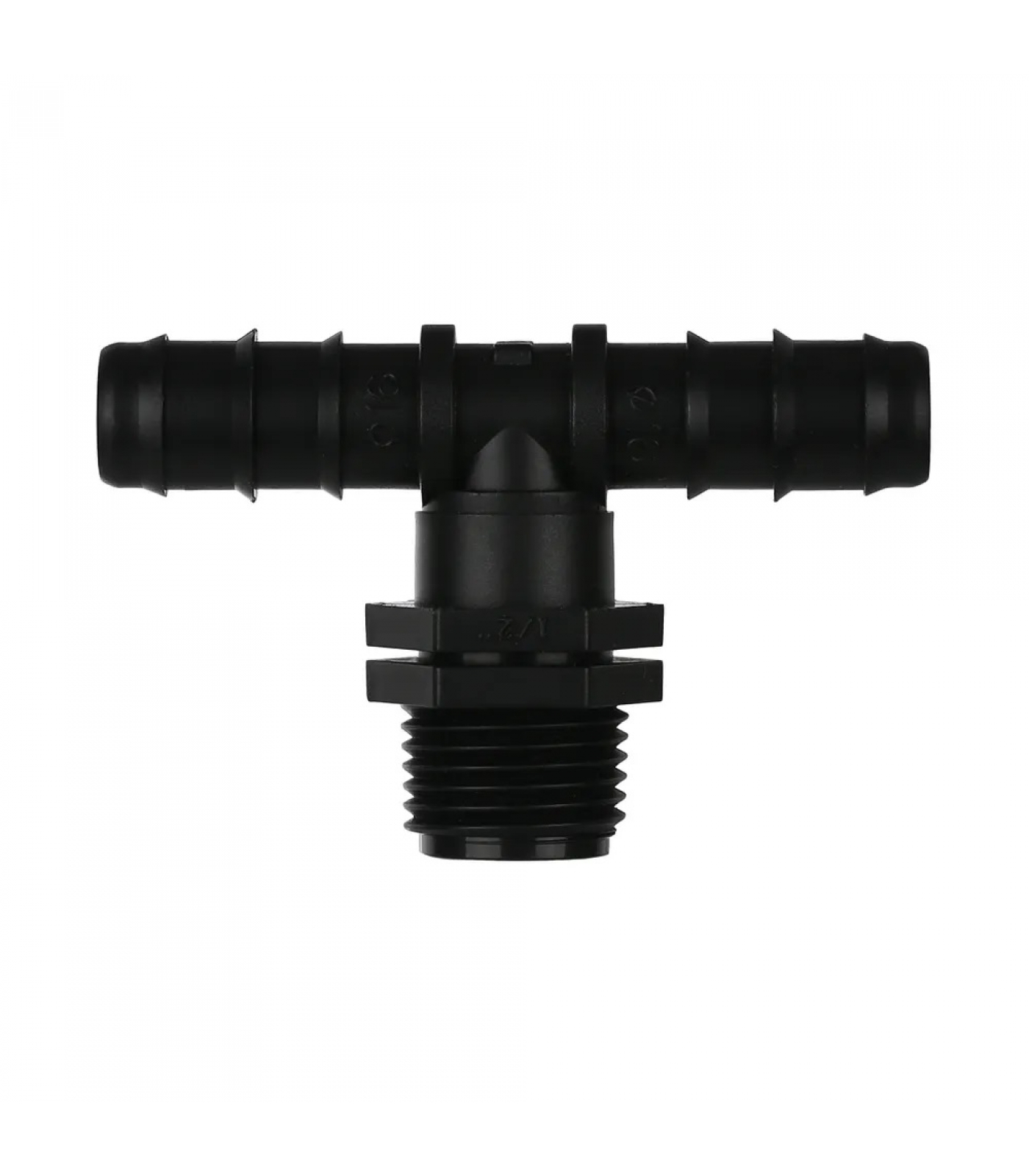 Тройник для магистральных трубок систем капельного полива. Заершенные выводы для надежного подключения без протечек. Наружная резьба на 1/2 для подключения к магистральному водопроводу.