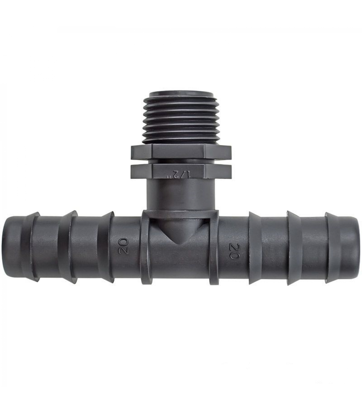 Тройник для магистральных трубок систем капельного полива. Заершенные выводы для надежного подключения без протечек. Наружная резьба на 1/2 для подключения к магистральному водопроводу.