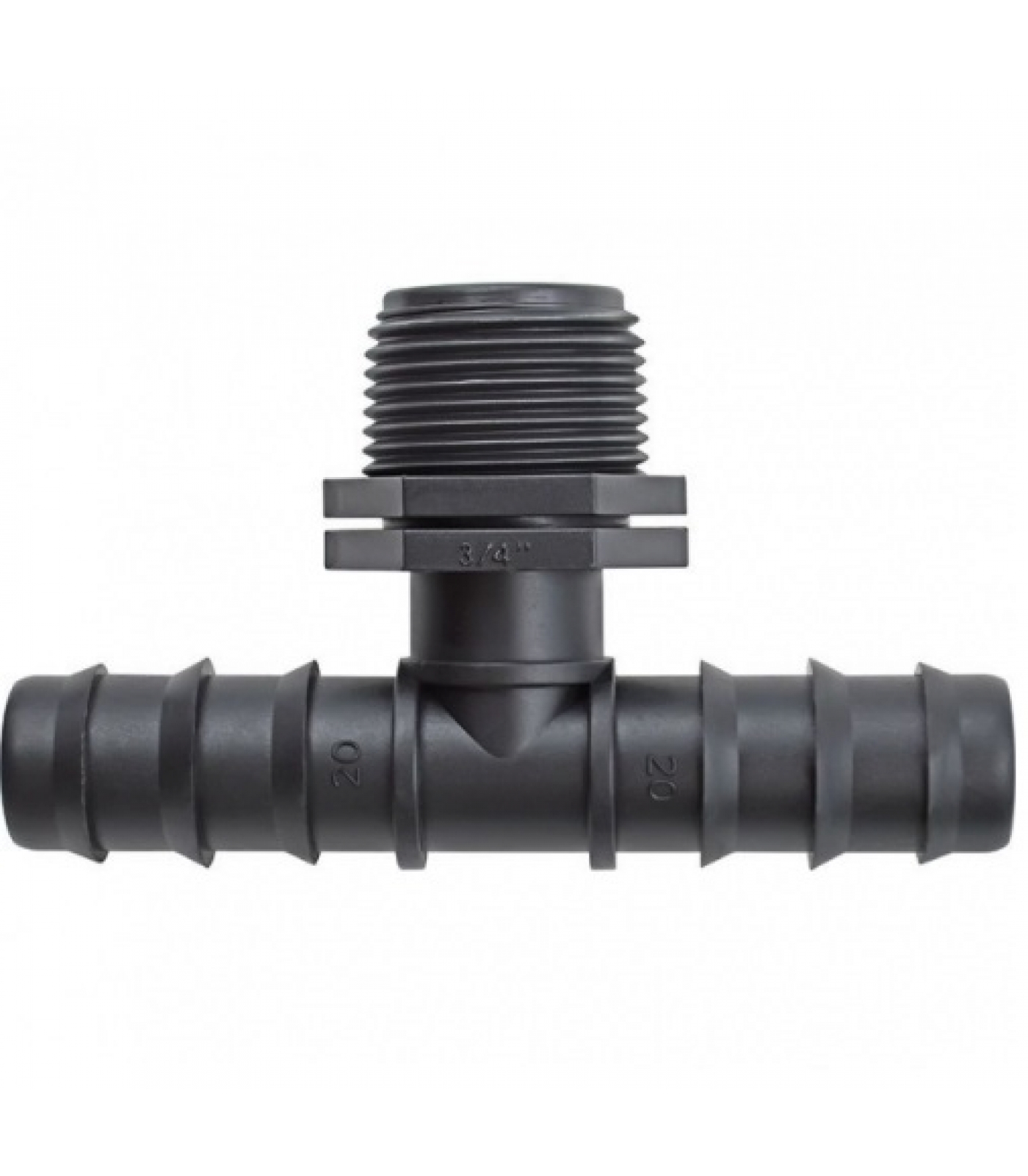Тройник для магистральных трубок систем капельного полива. Заершенные выводы для надежного подключения без протечек. Наружная резьба на 3/4 для подключения к магистральному водопроводу.