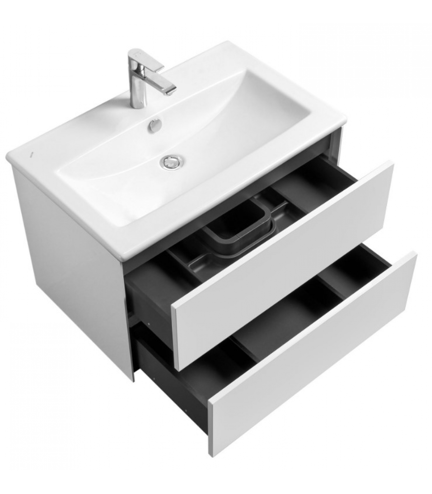 Тумба Сохо 60 функционально состоит из двух вместительных ящиков, оснащенных системой push to open, обеспечивающей надежное, комфортное и бесшумное закрывание. Фасады изделия выполнены из МДФ в белой глянцевой покраске, корпус из ламинированной влагостойкой ДСП в покраске белый глянец. Верхний и нижний ящики позволяют содержать косметические средства в идеальном порядке.