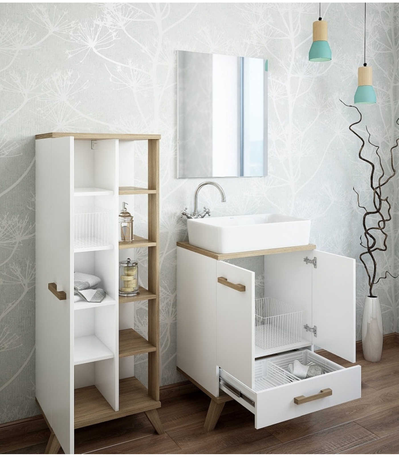 Тумба с раковиной «Ингрид» от российской компании Sanflor станет ярким дополнением интерьера просторной ванной комнаты в стиле ретро. Предназначена для использования в условиях повышенной влажности. Тумба изготовлена из влагостойкой ДСП с матовым эмалевым покрытием, не истирающимся в процессе эксплуатации, а лицевые кромки ламинированы, что придает им дополнительную износостойкость. Декоративные вставки произведены из ДСП, ламинированной пленкой ПВХ в оттенке «швейцарский вяз». Выдвижной ящик и внутреннее пространство за распашными дверцами.