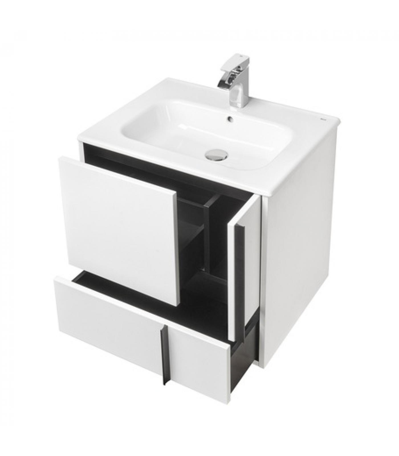 Эффектное классическое сочетание черного и белого - лаконичная и всегда беспроигрышная комбинация. Тумба Ривьера 60 выполнена из чёрной МДФ, покрытой белой матовой пленкой, что позволяет создать яркий контраст чёрного и белого. Пленка позволяет надежно защитить мебель от воздействия влажной среды ванной комнаты. Модель отличается удобной системой организации: верхний ящик тумбы оснащен системой push-to-open, справа находится распашной фасад-створка с отдельным отсеком для хранения, а вместительный нижний ящик позволит удобно расположить косметические и моющие средства. Необычные чёрные матовые ручки комфортны в использовании и подчеркивают четкую геометрию линий. Комфорт при использовании обеспечивают надежные петли с доводчиками и направляющие с системой плавного закрывания. Для комплектации тумбы идеально подойдет керамическая раковина Victoria Unik от бренда Roca.
