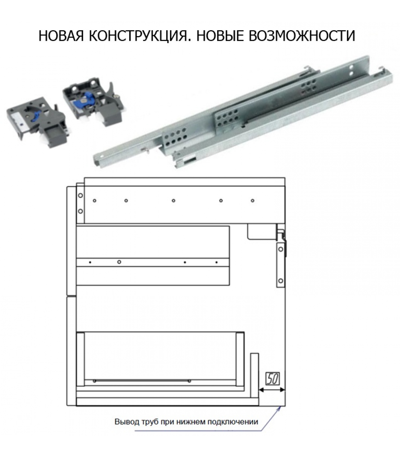 В тумбе имеются два ящика, изготовленные из декоративной влагостойкой ДСП. Нижний ящик тумбы – широкий и вместительный – предназначен для крупных предметов, а в верхнем имеется специальная организация пространства, позволяющая хранить мелкие вещи.