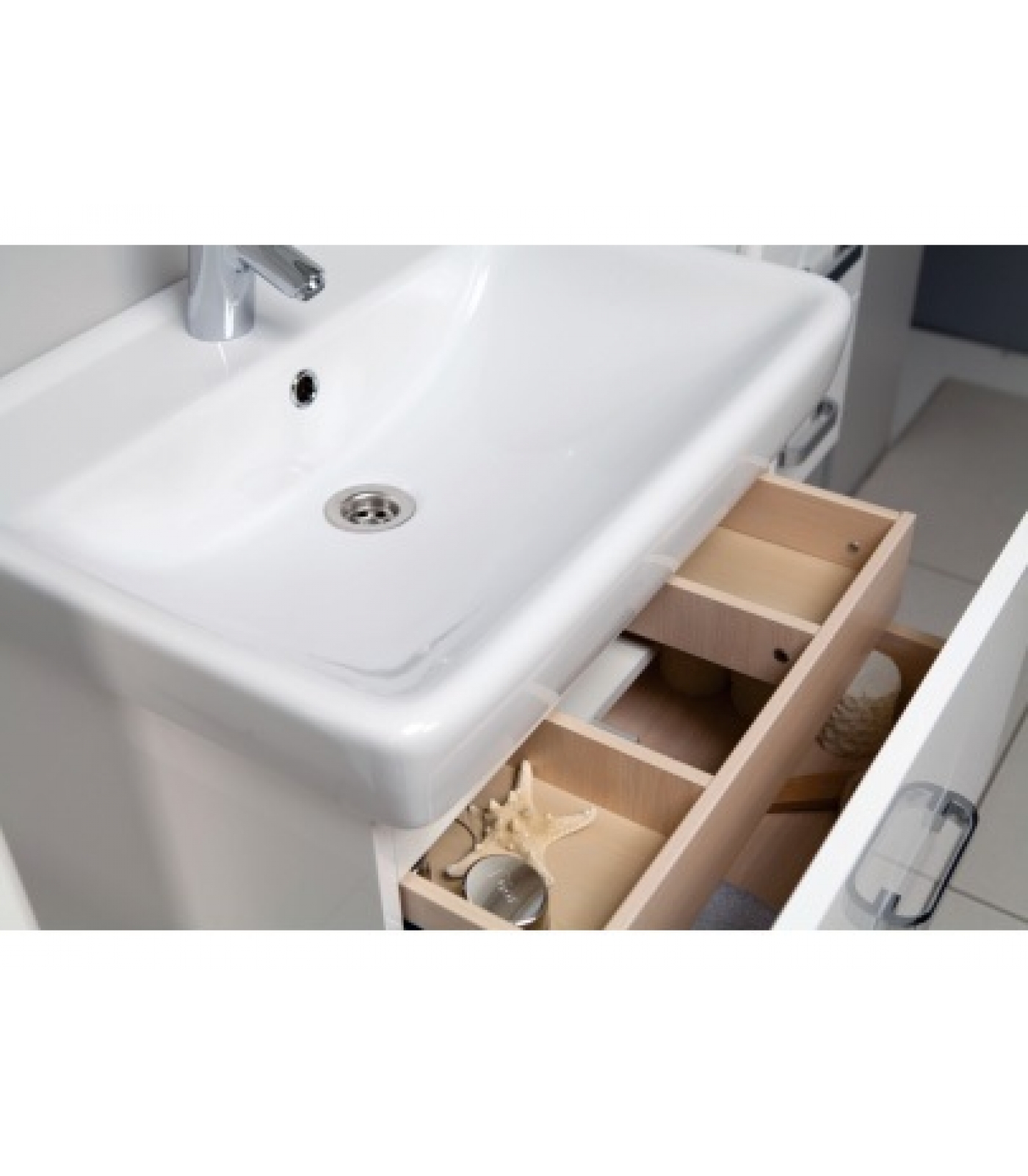 Современная лаконичная модель тумбы AQUATON Америна 70 Н шириной 70 см с двумя внешними ящиками и одним встроенным выполнена в белоснежном глянцевом цвете. Корпус изготовлен из влагостойкой ЛДСП, а фасад - из высококачественной МДФ. Тумбы данной модификации устанавливаются на ножки. Направляющие нижнего крепежа обеспечивают жесткое и надежное крепление ящиков, а встроенные доводчики гарантируют их бесшумное и плавное закрывание. Дополнительно организовано нижнее подключение труб водоснабжения и канализации. Корпус и фасады покрыты полиэфирной краской ультрафиолетового отверждения, обеспечивающей дополнительную защиту от влаги.