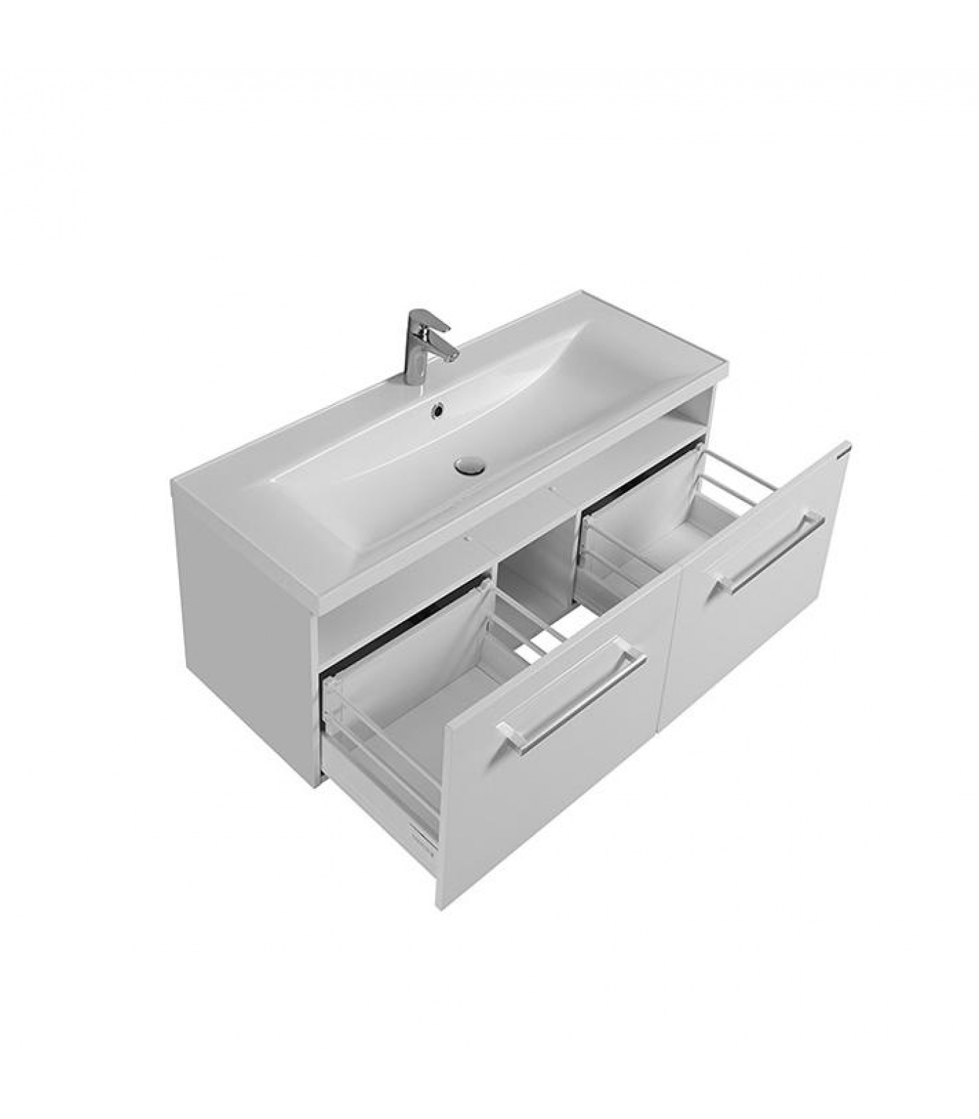 Тумба Мадрид 100 М от AQUATON в белом цвете - воплощение эстетики минимализма в чистом виде. Модель привлекает внимание простотой форм и четкостью линий. Благодаря подвесной конструкции изделие не занимает много места и обеспечивает легкую уборку в ванной комнате. Корпус из влагостойкой ЛДСП и фасад из высококачественной МДФ покрыты полиэфирной краской ультрафиолетового отверждения с высокой степенью глянца, которая обеспечивает изделию привлекательный внешний вид, а также износостойкость и долговечность. Тумба оснащена двумя вместительными ящиками с доводчиками и встроенной системой плавного закрывания и комплектуется удобной раковиной из литого мрамора.