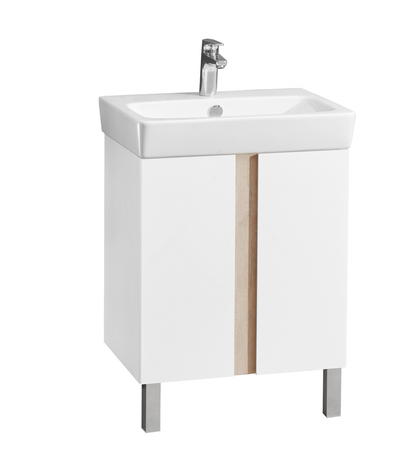 Лаконичная тумба Кантри выполнена в современном дизайне: сочетание белого глянца (ВЛДСП в покраске) с древесным акцентом в цвете дуб верона (ламинированное влагостойкое ДСП). Все детали тумбы выполнены из влагостойкой ламинированной ДСП, предназначенной для использования в условиях ванной комнаты. Благодаря специальной обработке торца фасада под углом, открытие производится за створки. Универсальный функционал тумбы – распашные створки, за которыми расположена полочка. Регулируемые опоры в комплекте.