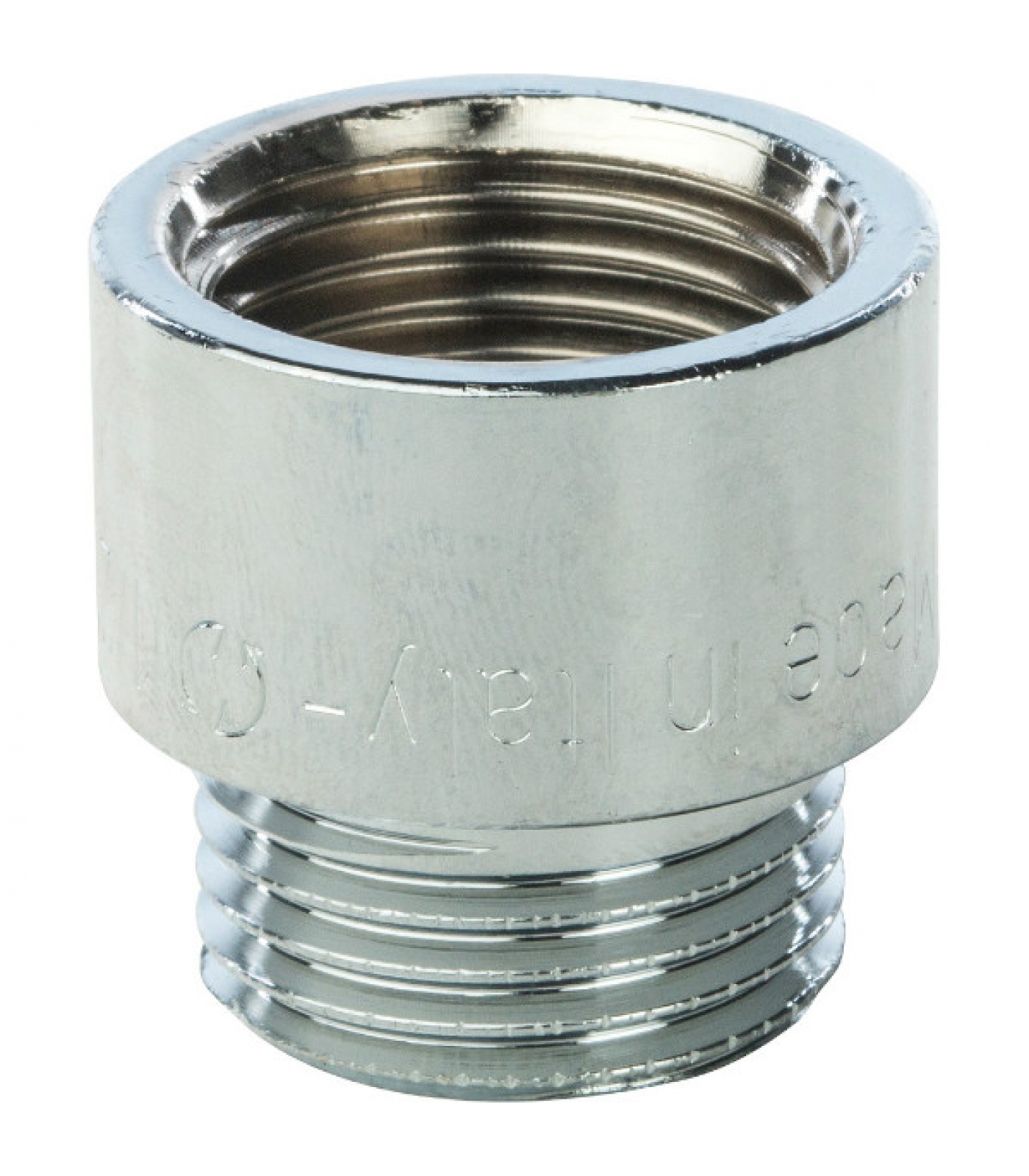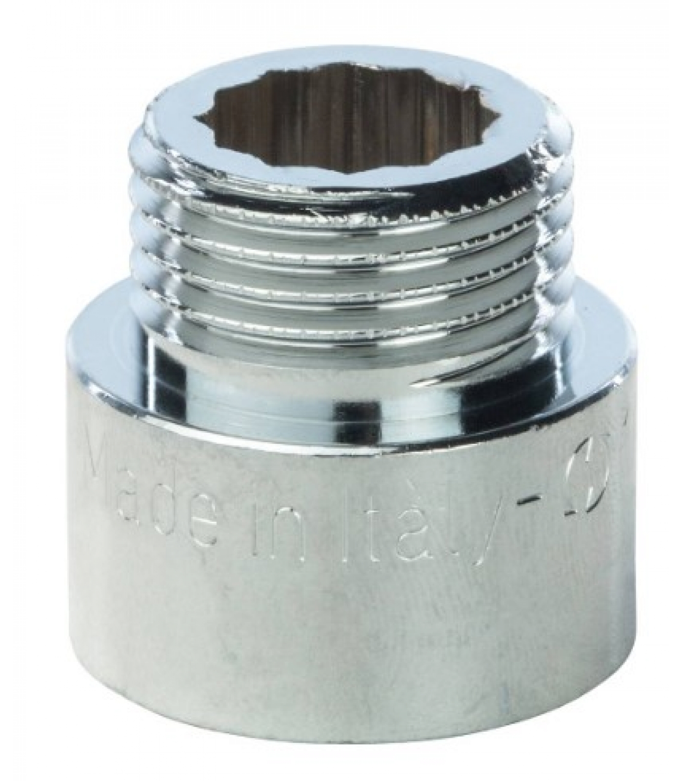 Удлинитель – фитинг, используемый в качестве соединительного элемента в трубах. Элемент представляет собой цилиндр с укороченной резьбой. С одной стороны она нарезана на внешней части корпуса, с другой – на внутренней. Внутренний диаметр изделия выполнен в виде многогранника для удобного и быстрого монтажа. Материал конструкции - хромированная латунь, которая отличается своими антикоррозийными и эксплуатационными свойствами.