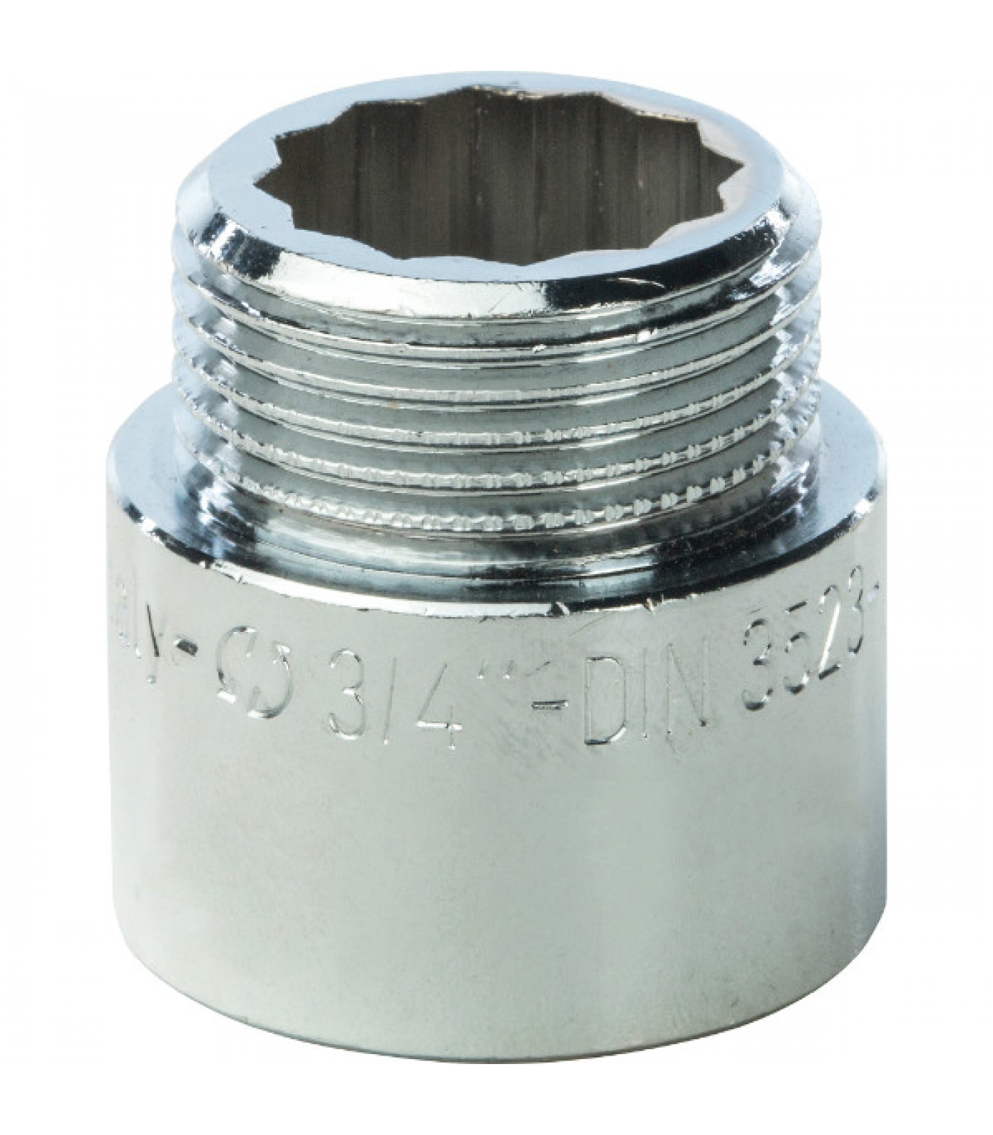Удлинитель – фитинг, используемый в качестве соединительного элемента в трубах. Элемент представляет собой цилиндр с укороченной резьбой. С одной стороны она нарезана на внешней части корпуса, с другой – на внутренней. Внутренний диаметр изделия выполнен в виде многогранника для удобного и быстрого монтажа. Материал конструкции - хромированная латунь, которая отличается своими антикоррозийными и эксплуатационными свойствами.