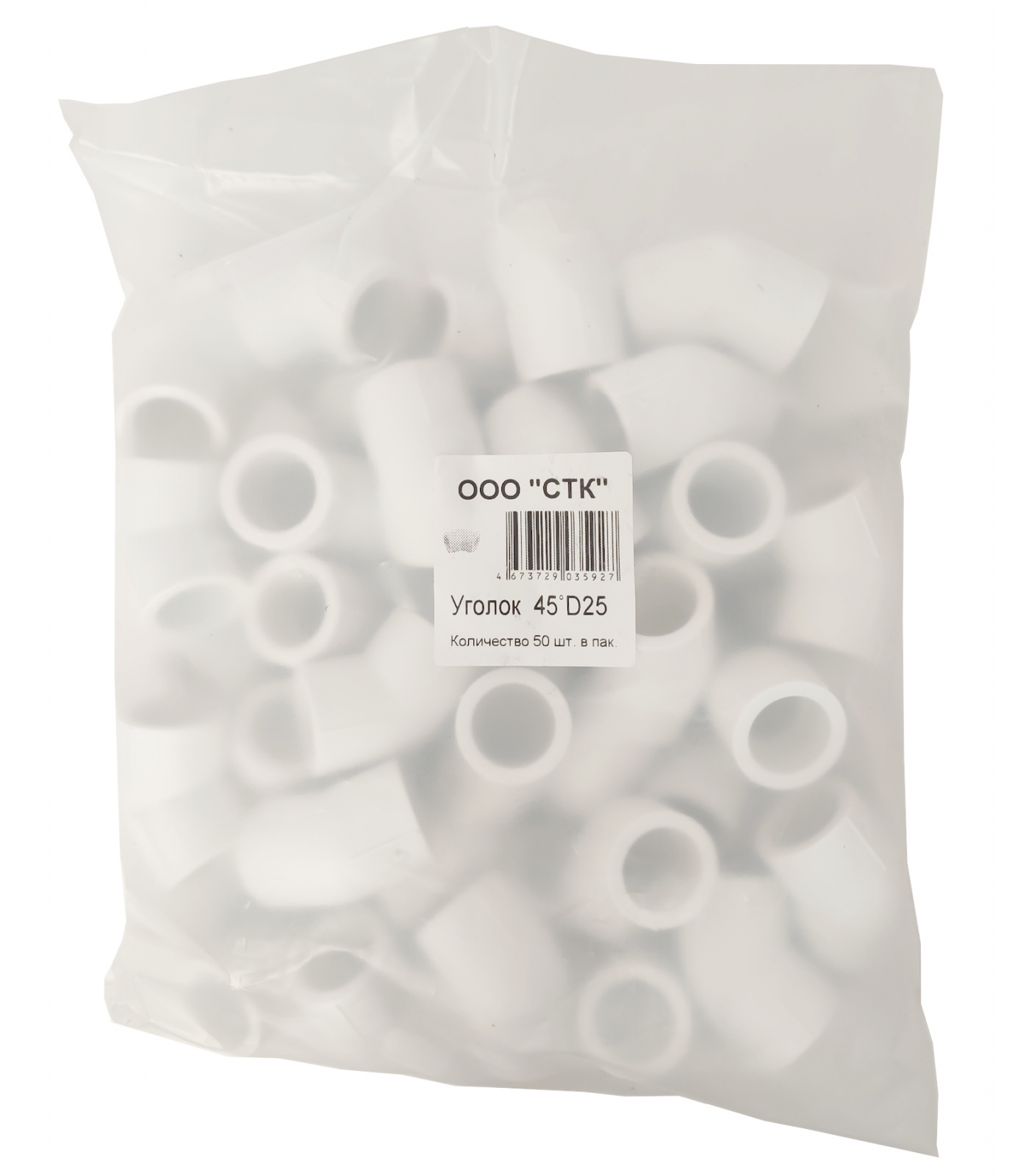 Угольник 25 мм 45° СТК PP-R белый, пакет 50 шт