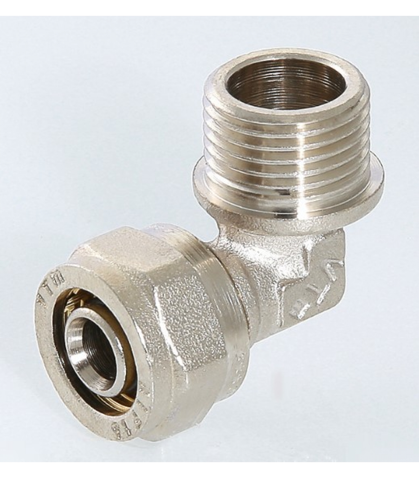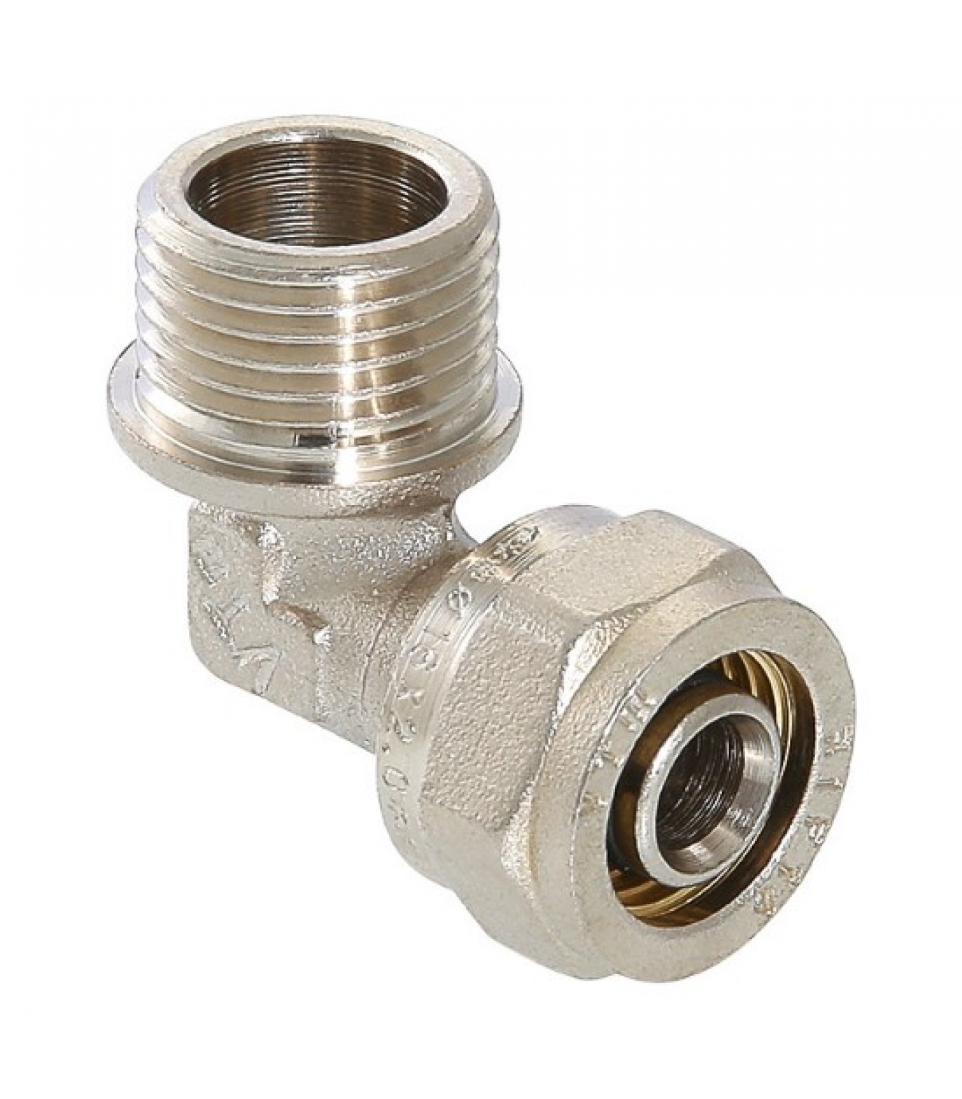 (VTm.353.N) Фитинг обжимной – угольник с переходом на наружную резьбу для металлополимерных (металлопластиковых) трубопроводов. Резьба фитинга – наружная трубная по ГОСТу 6357.