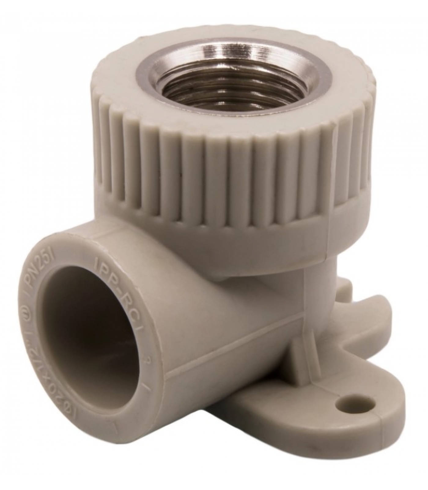 Угольник с внутренней резьбой и креплением используется для соединения под углом 90° и одновременного крепления к вертикальной плоскости трубы PPR с резьбовым фитингом с наружной резьбой.