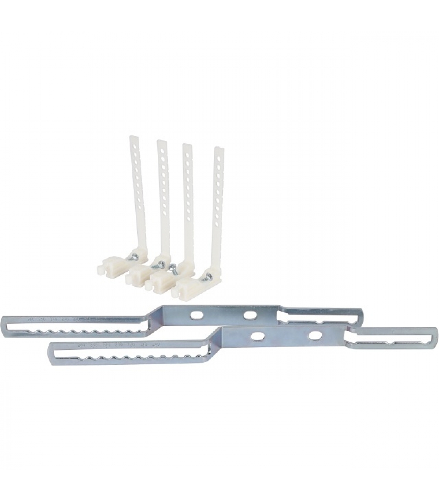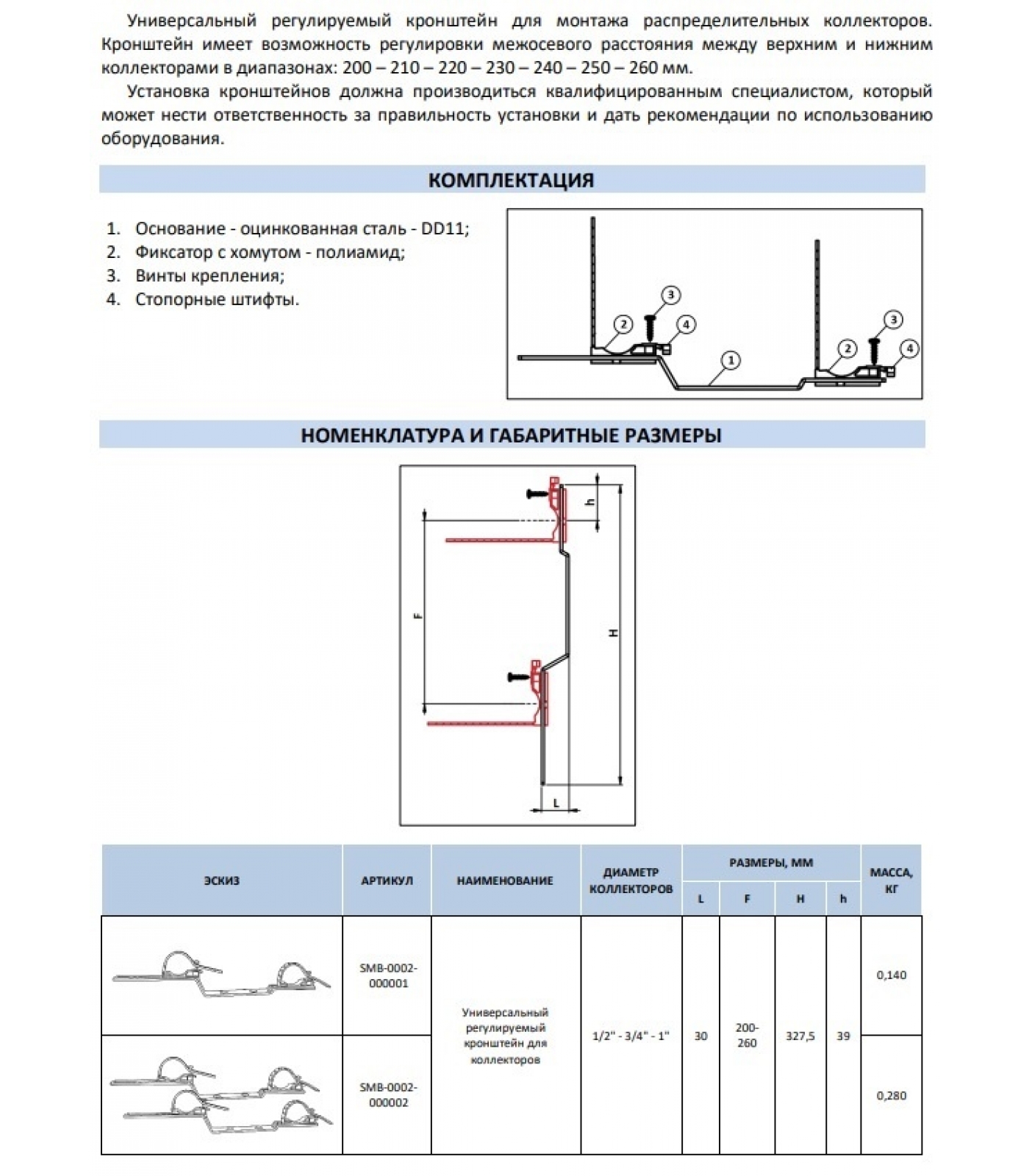 Универсальный регулируемый кронштейн для монтажа распределительных коллекторов. Кронштейн имеет возможность регулировки межосевого расстояния между верхним и нижним коллекторами в диапазонах: 200 – 210 – 220 – 230 – 240 – 250 – 260 мм.