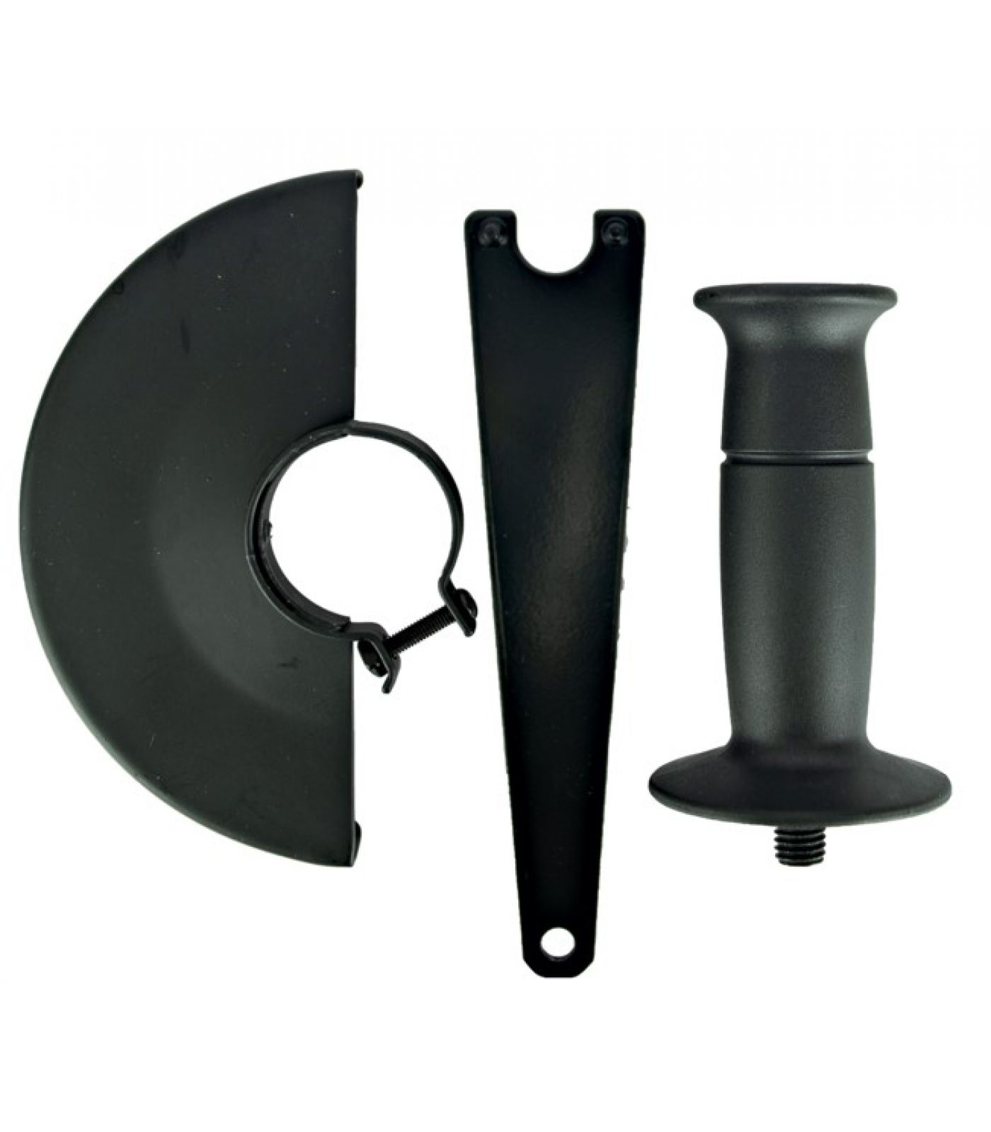 Гайки для крепления диска, комплект щеток, дополнительная рукоятка, ключ, защитный кожух в комплекте.