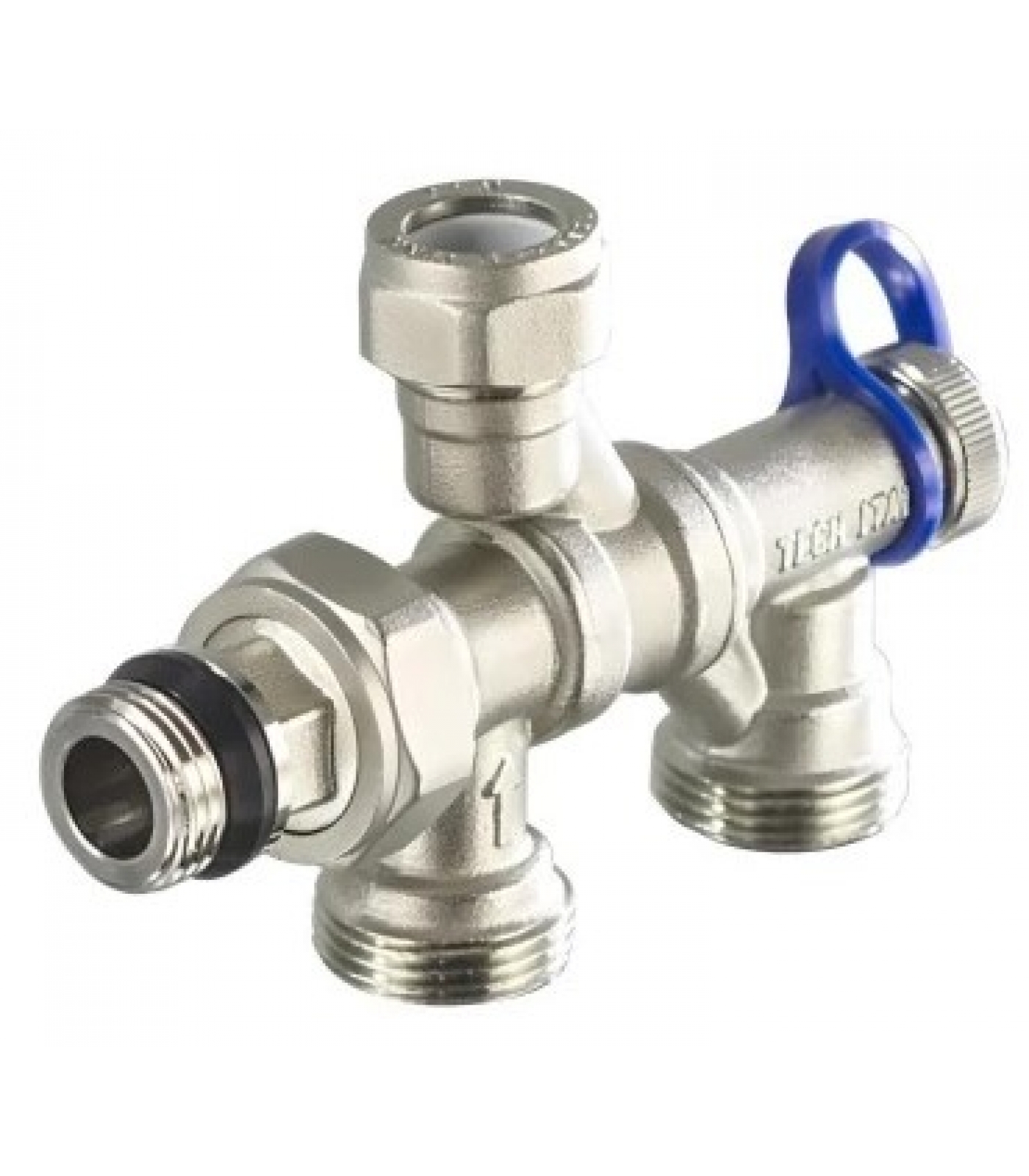Узел 4-х ходовой универсальный распределительный для подключения радиатора 360˚ является частью комплекта для бокового подключения радиатора к подводящим трубопроводам, расположенным снизу (в полу, в плинтусе, над плинтусом). Узел оснащен вращающимися на 360˚ соединениями для подключения к трубам, расположенным в полу или стене.