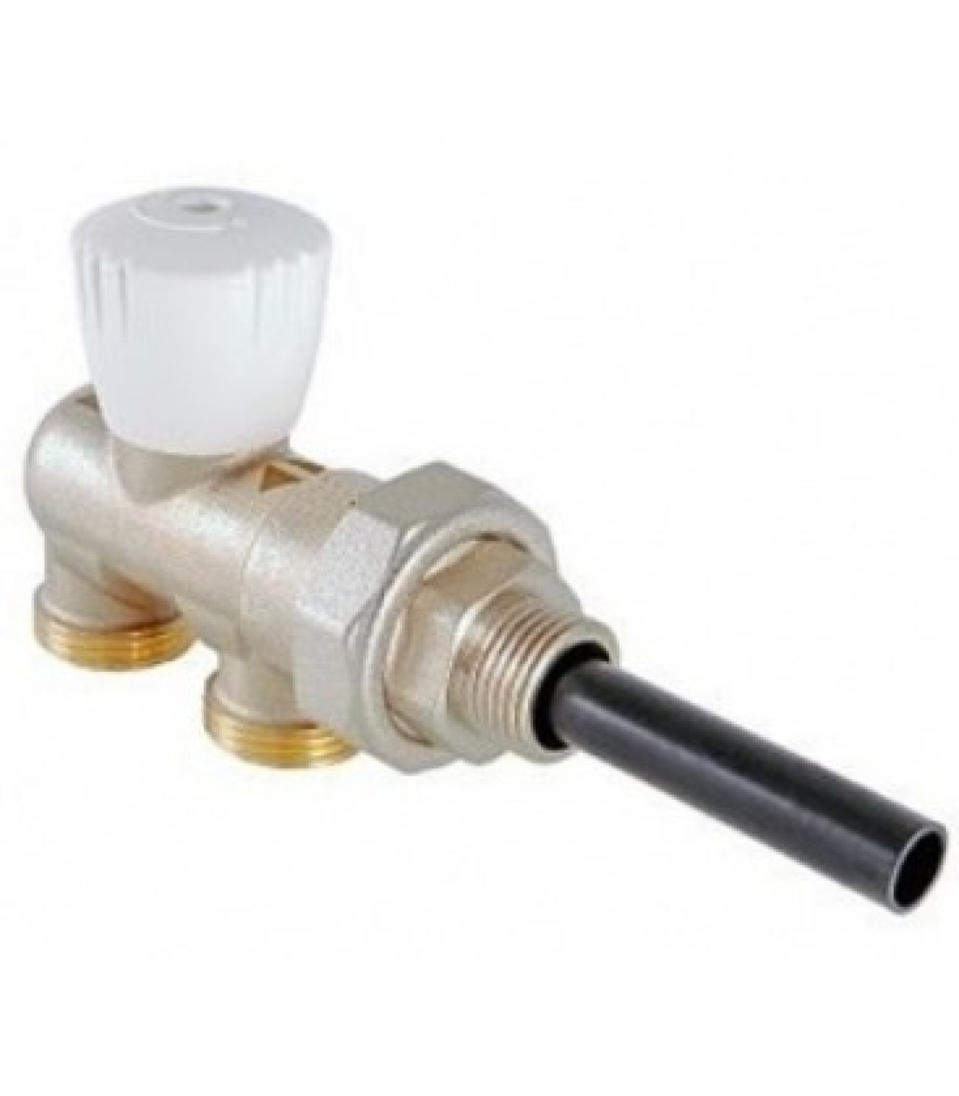 Регулирование расхода теплоносителя через радиатор – ручным клапаном вертикальной компоновки. Клапан узла 100 % в полностью открытом состоянии направляет весь поток теплоносителя через отопительный прибор, в промежуточном положении часть потока направляется в байпас.