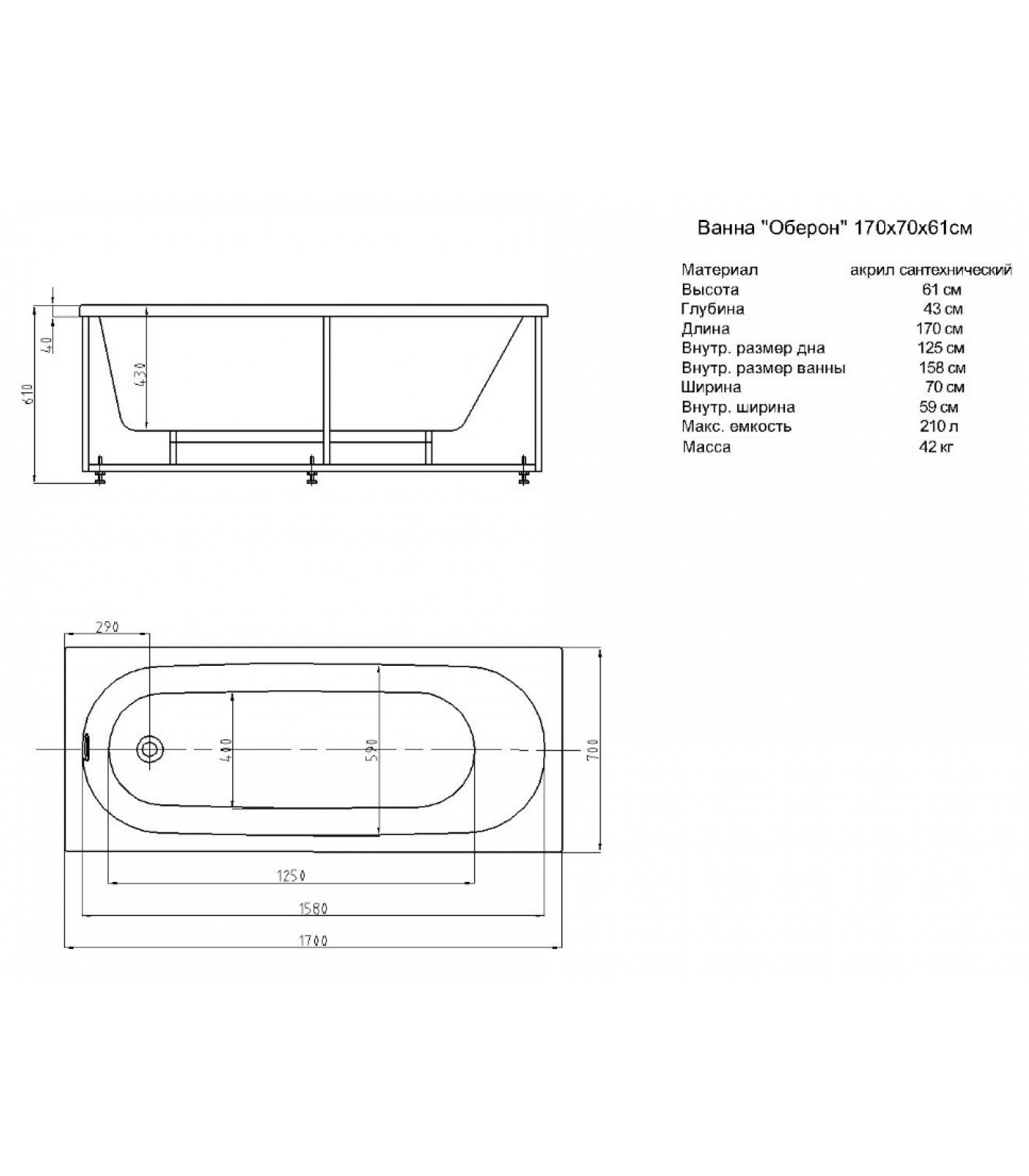 Акриловая ванна Aquatek Оберон 170 прямоугольная, универсальная, без каркаса, без экрана, без гидромассажа