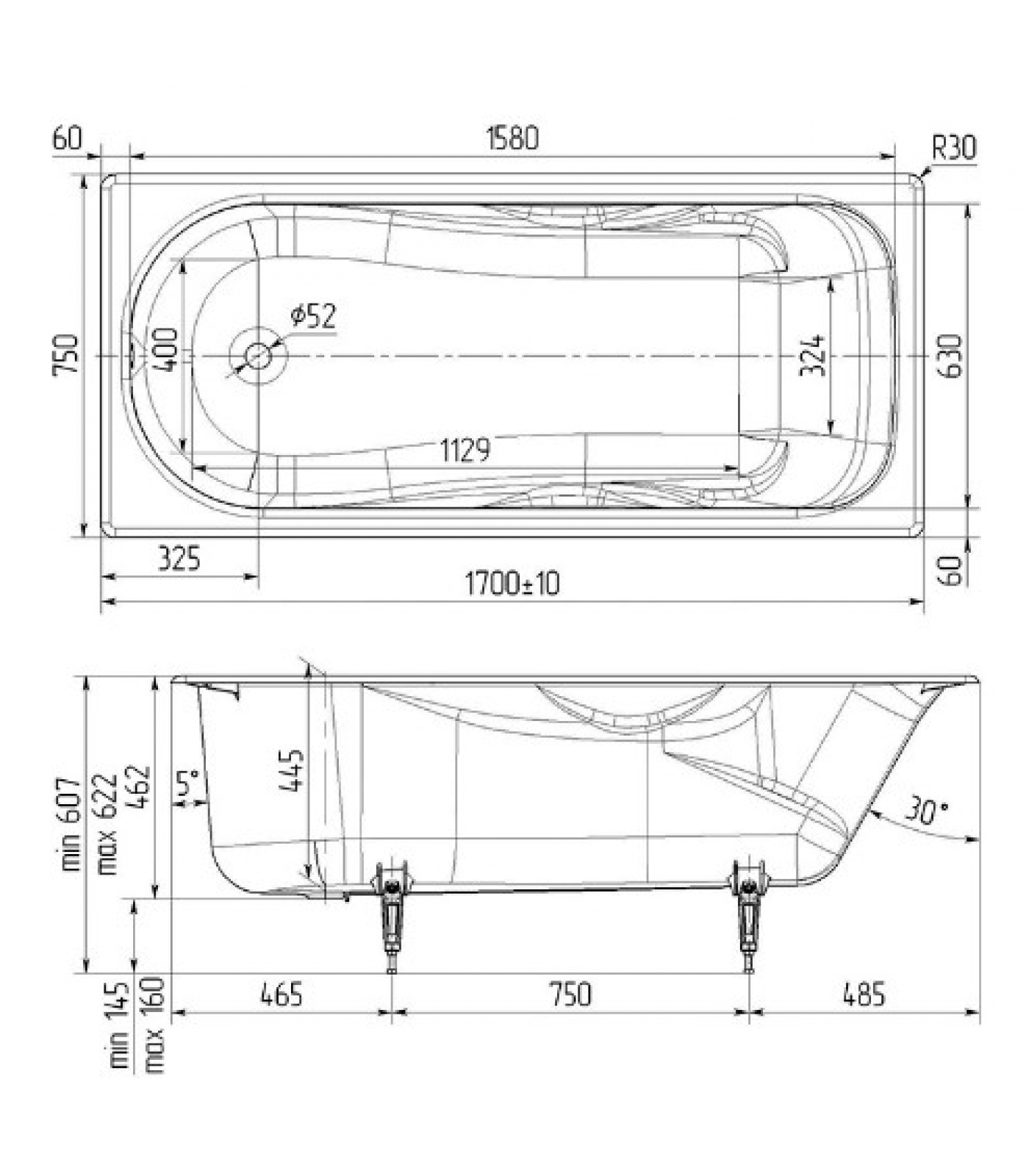 Толщина стенки чугунной ванны бренда Wotte составляет 5 мм ±0,5 мм, толщина дна - 6 мм ±0,5 мм.