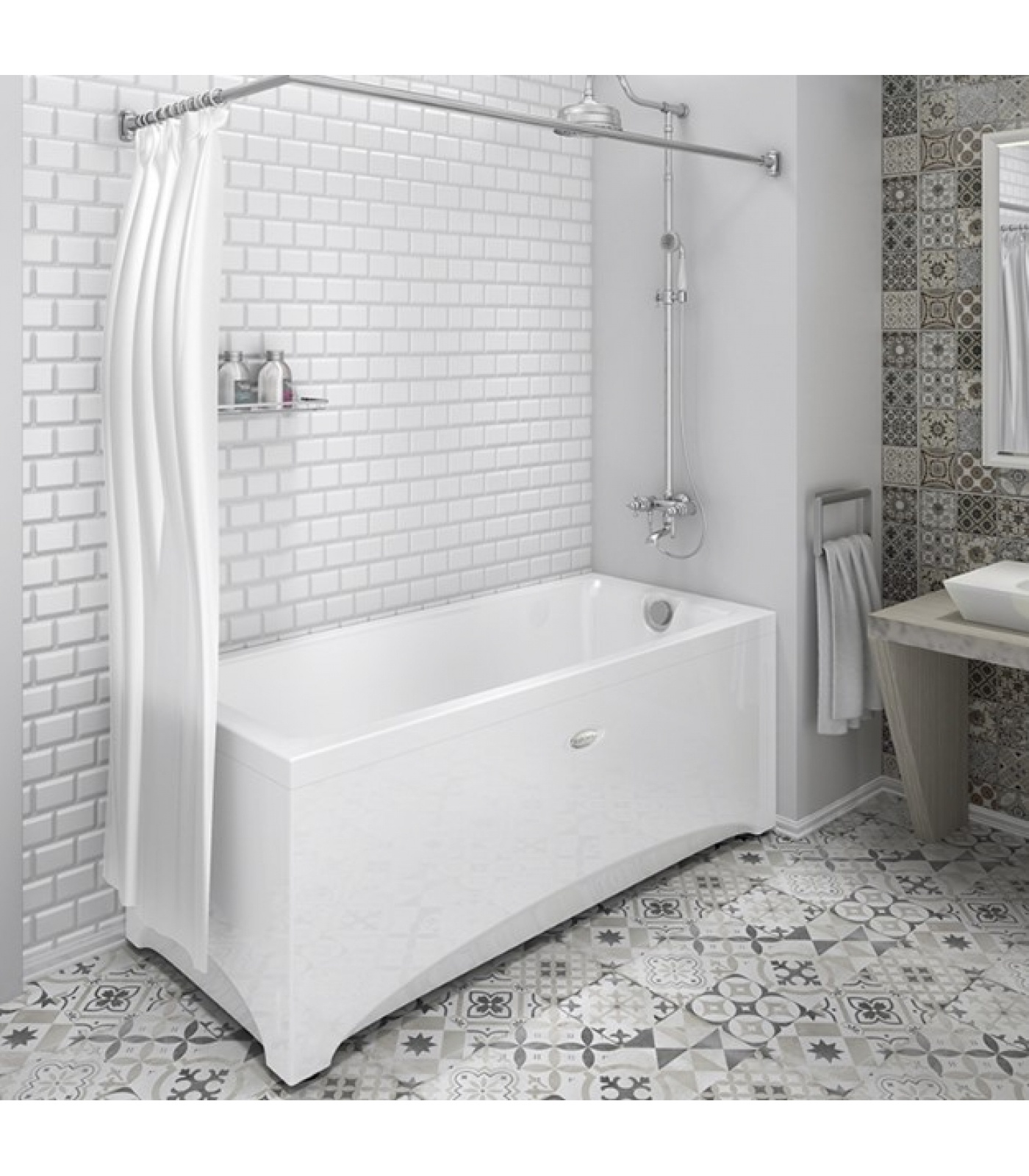 Прямоугольная форма универсальна для любой ванной комнаты: можно установить в угол, вдоль стены или вписать в нишу