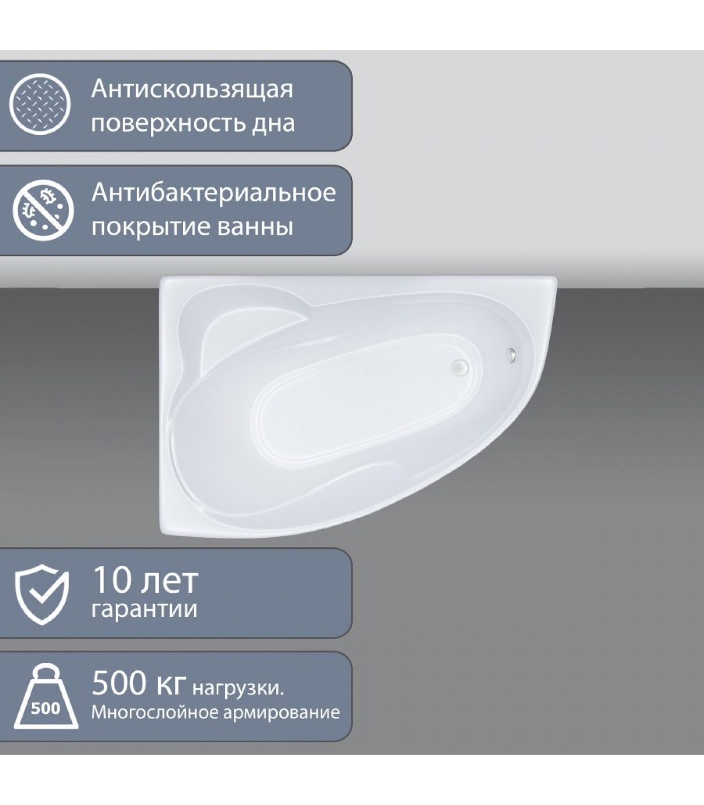 Акриловая ванна «КАЙЛИ» правая. Дно с рифленой массажной поверхностью, широкая спинка с подголовником. Ванна устанавливается на каркас из металла, который входит в комплект поставки. Эта часть конструкции отличается высокой прочностью. Благодаря этому ванна – даже когда ее будут использовать люди с большим весом – не сломается и всегда будет оставаться безопасной.