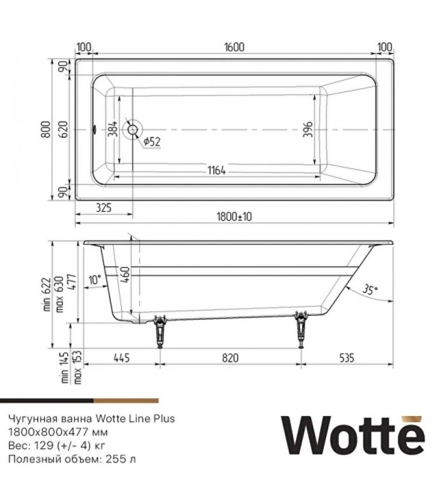 Чугунные ванны линии Wotte Line Plus имеют прямоугольную форму, универсальный дизайн, широкое дно, глубокую чашу и плоский борт.
