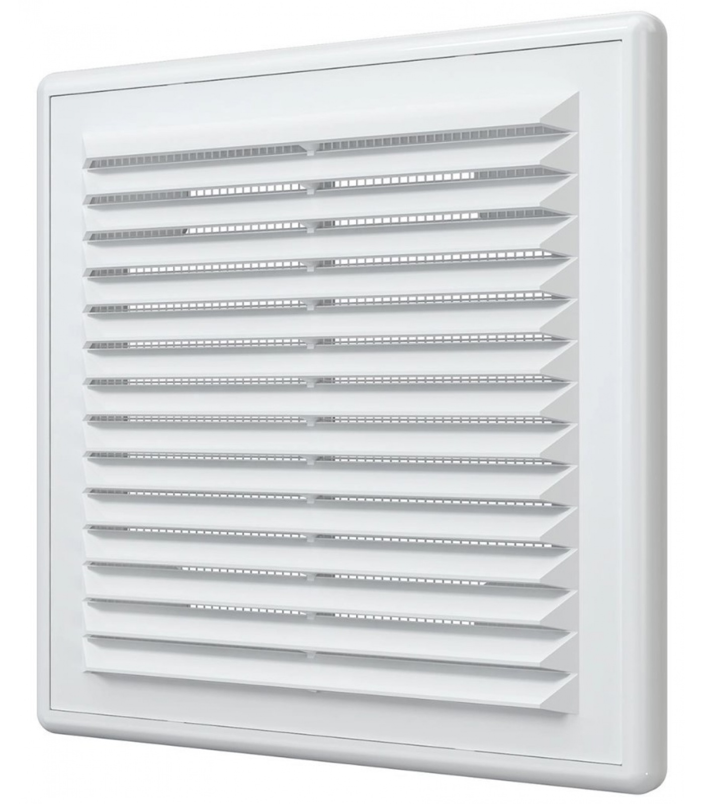 Решетка оснащена наклонными жалюзи, которые помогают скрыть вентиляционный выход, а также антимоскитной сеткой для защиты от насекомых.