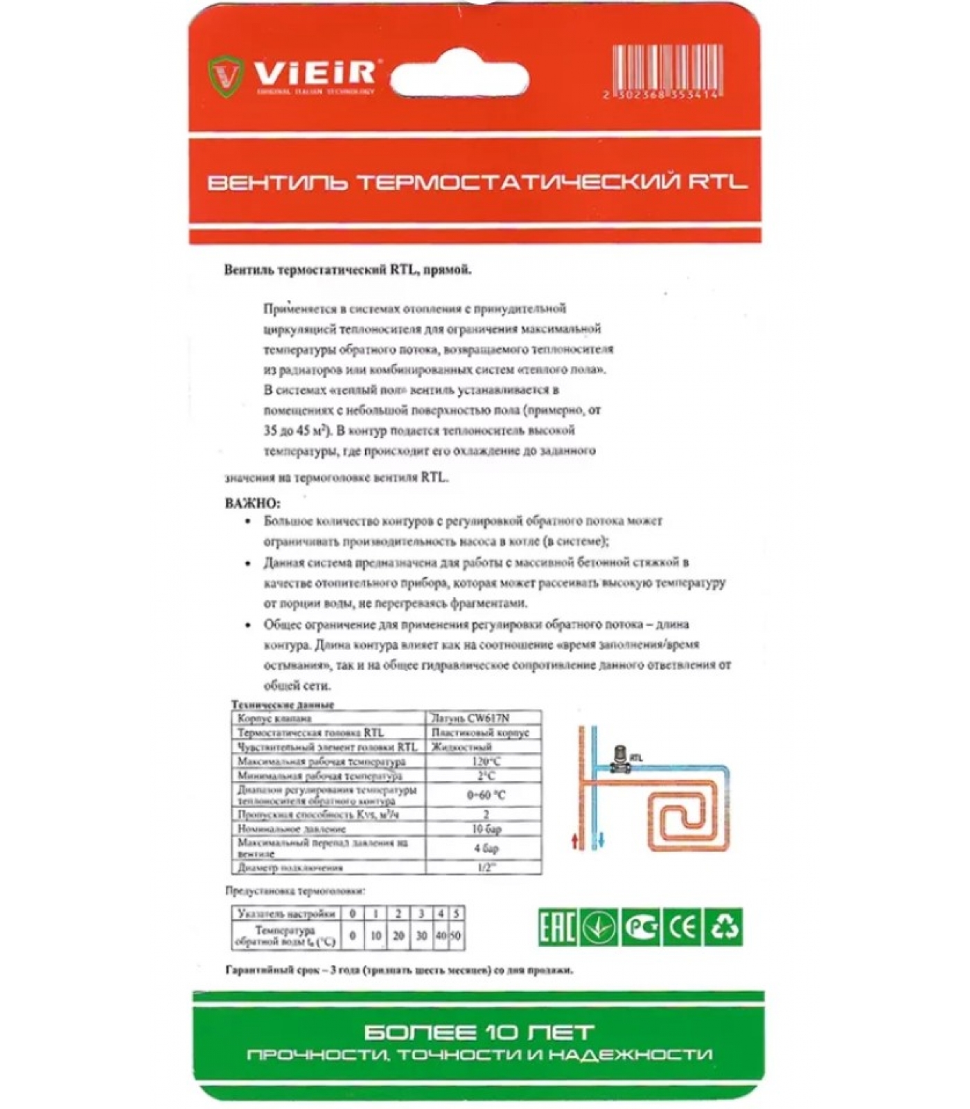 Vieir Вентиль термостатический RTL прямой VR341 с термоголовкой RTL