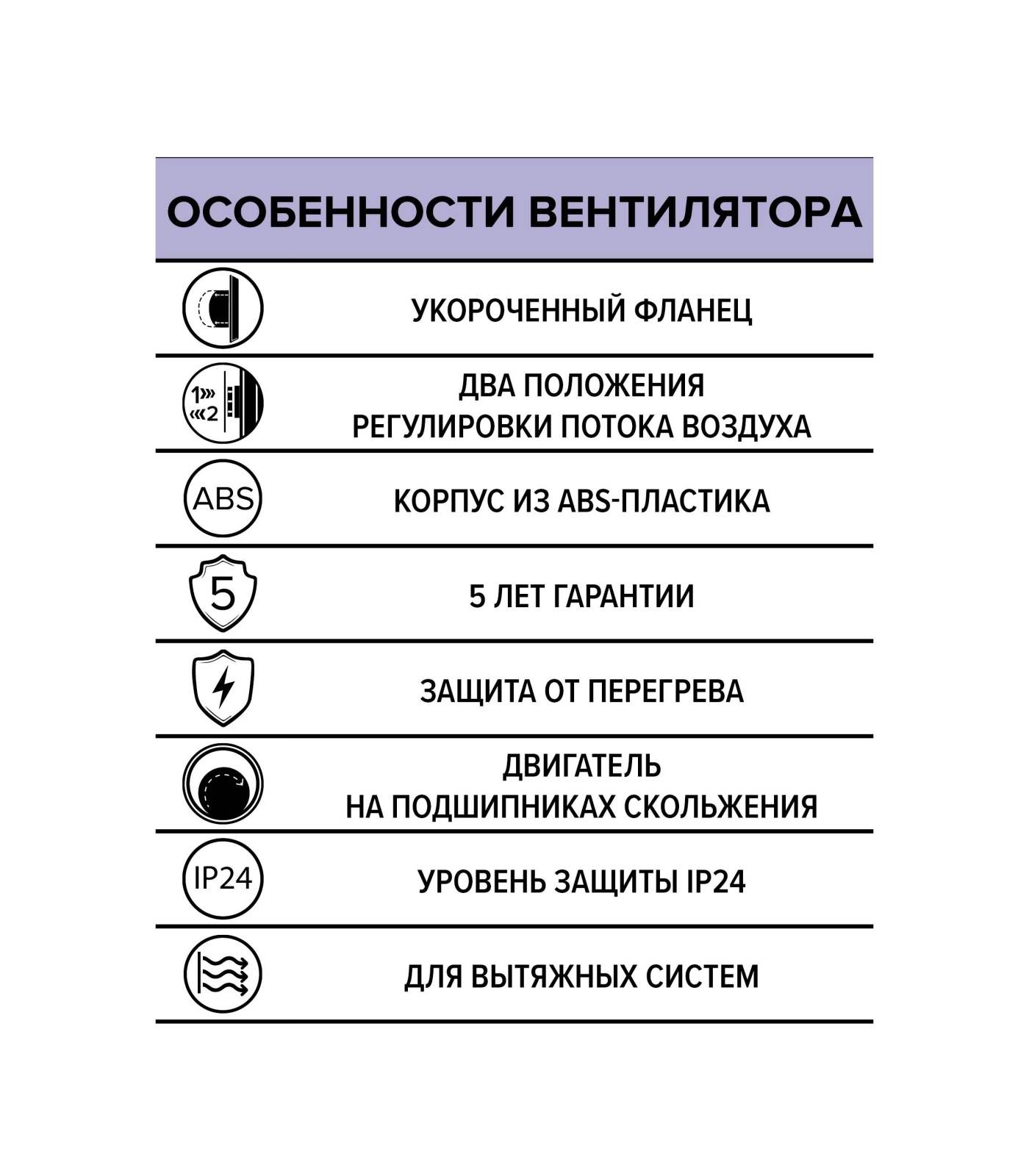 Укороченный фланец сохраняет эффективность работы вентилятора при установке в вентиляционную шахту;