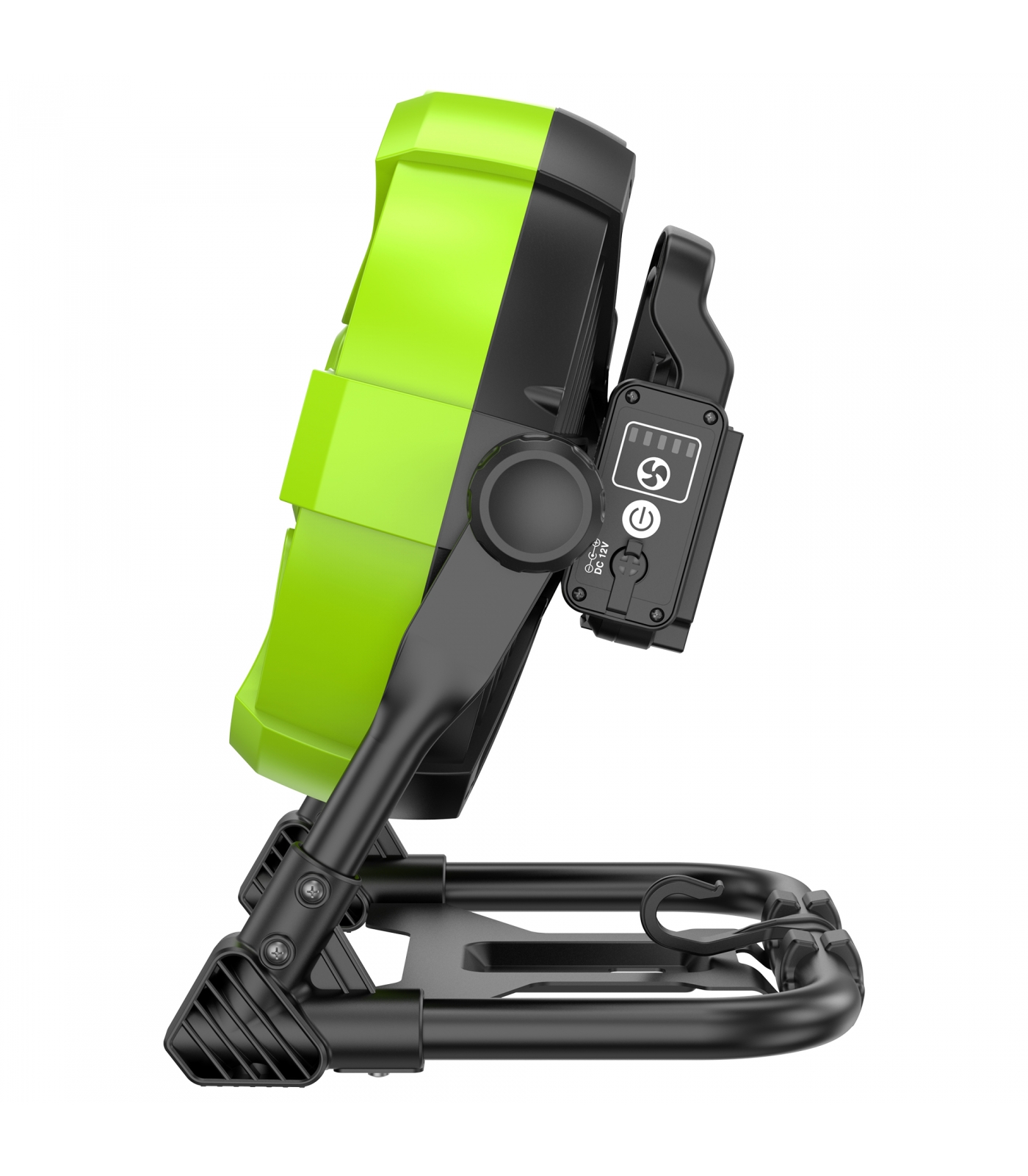 Аккумуляторный вентилятор с гибридными питанием Greenworks G24FAN можно легко закрепить на стене или на трубе благодаря встроенной в раму проушине и S-образному крюку для подвеса.