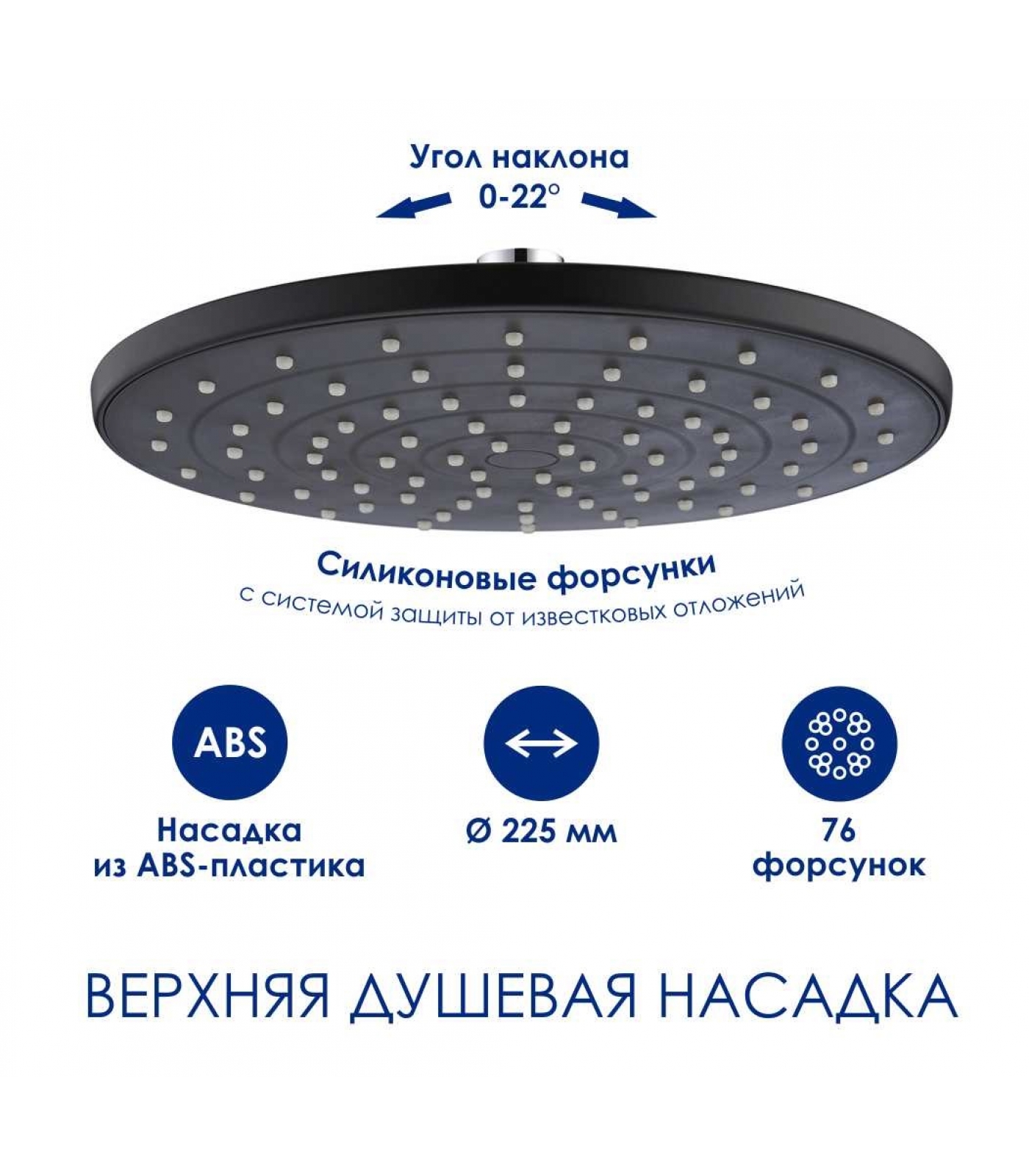 Верхняя душевая насадка WasserKRAFT A077 производится из ABS-пластика. Форсунки из силикона с системой защиты от известковых отложений. Насадка крепится к штанге при помощи шарнирного соединителя, внутрь которого встроен сетчатый аэратор для равномерного распределения воды. Также шарнирный соединитель позволяет менять угол наклона душевой насадки от 0 до 22 градусов.