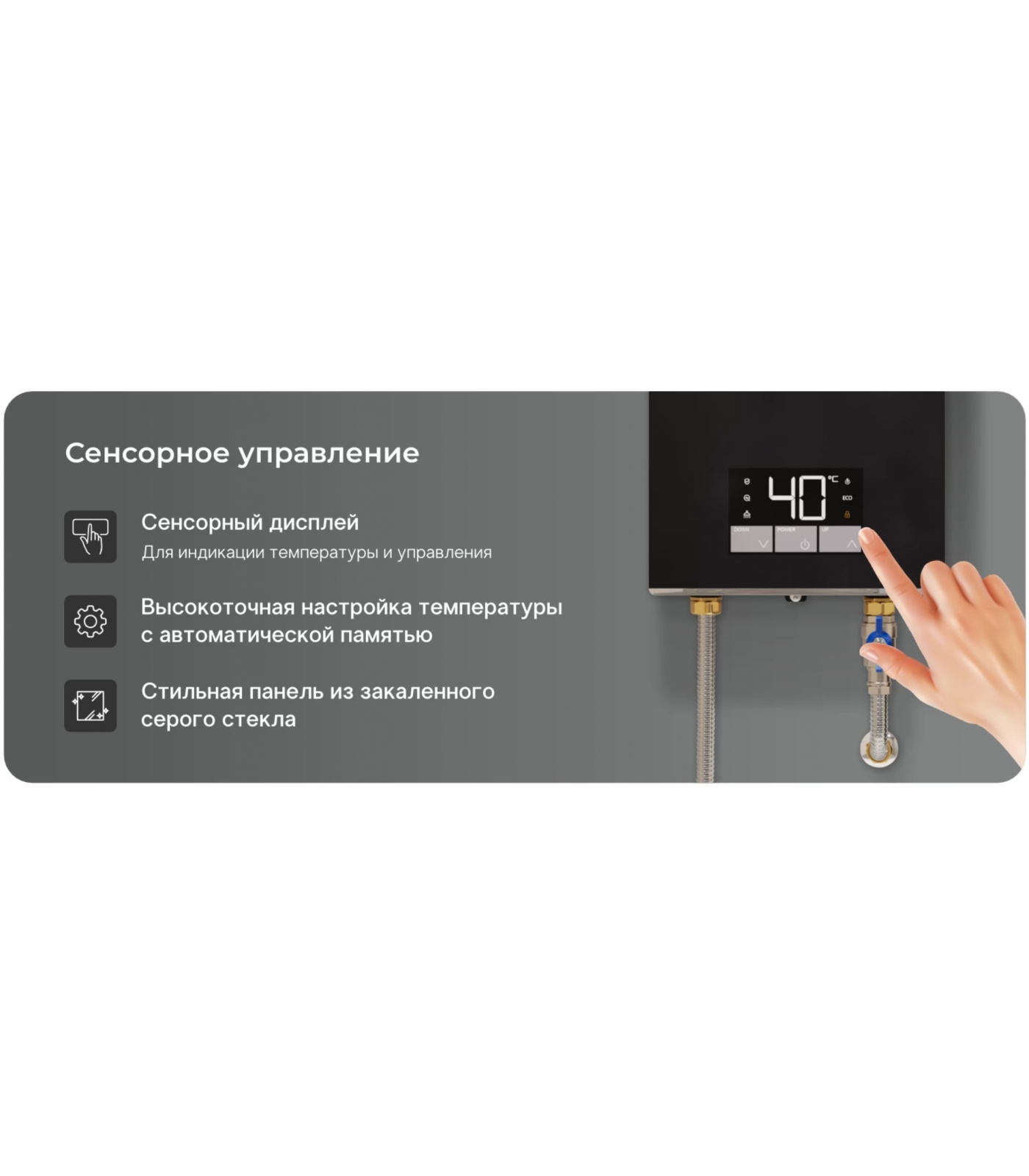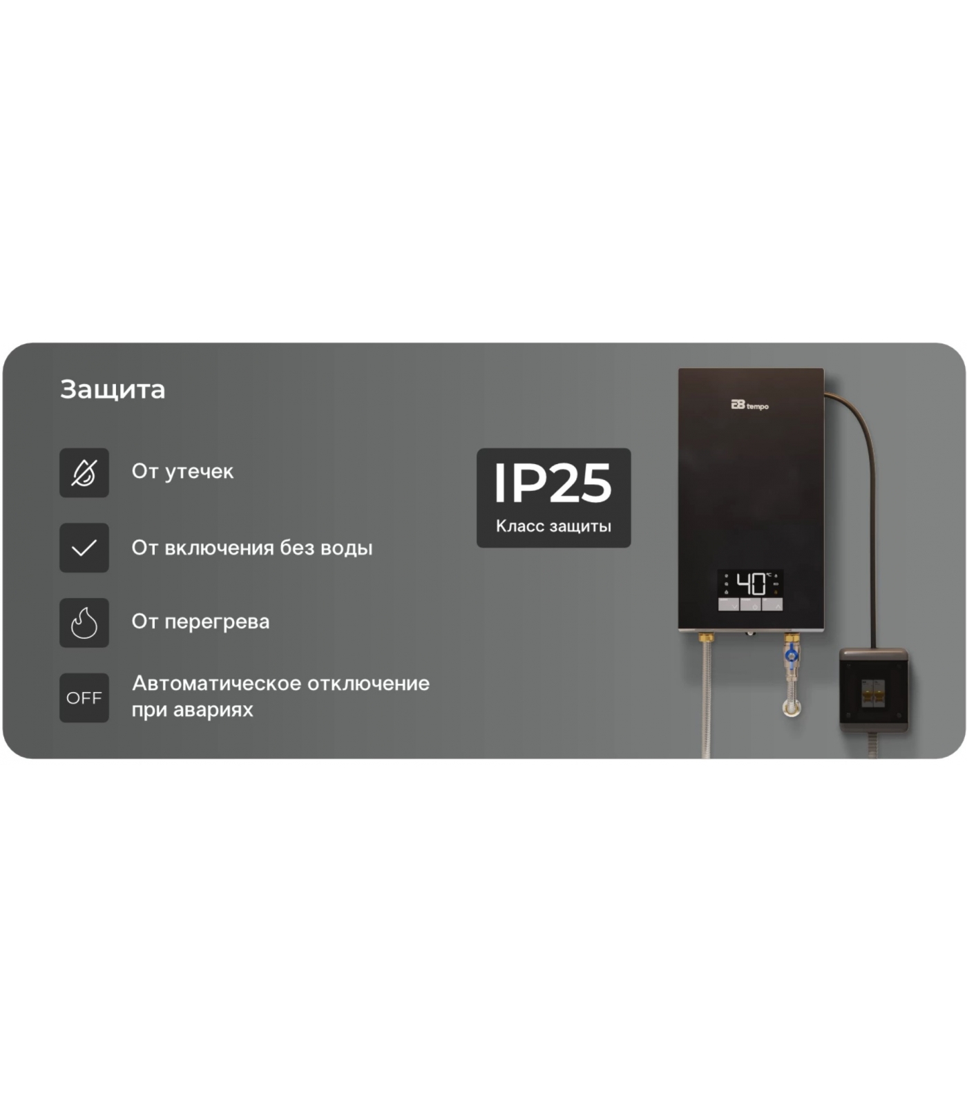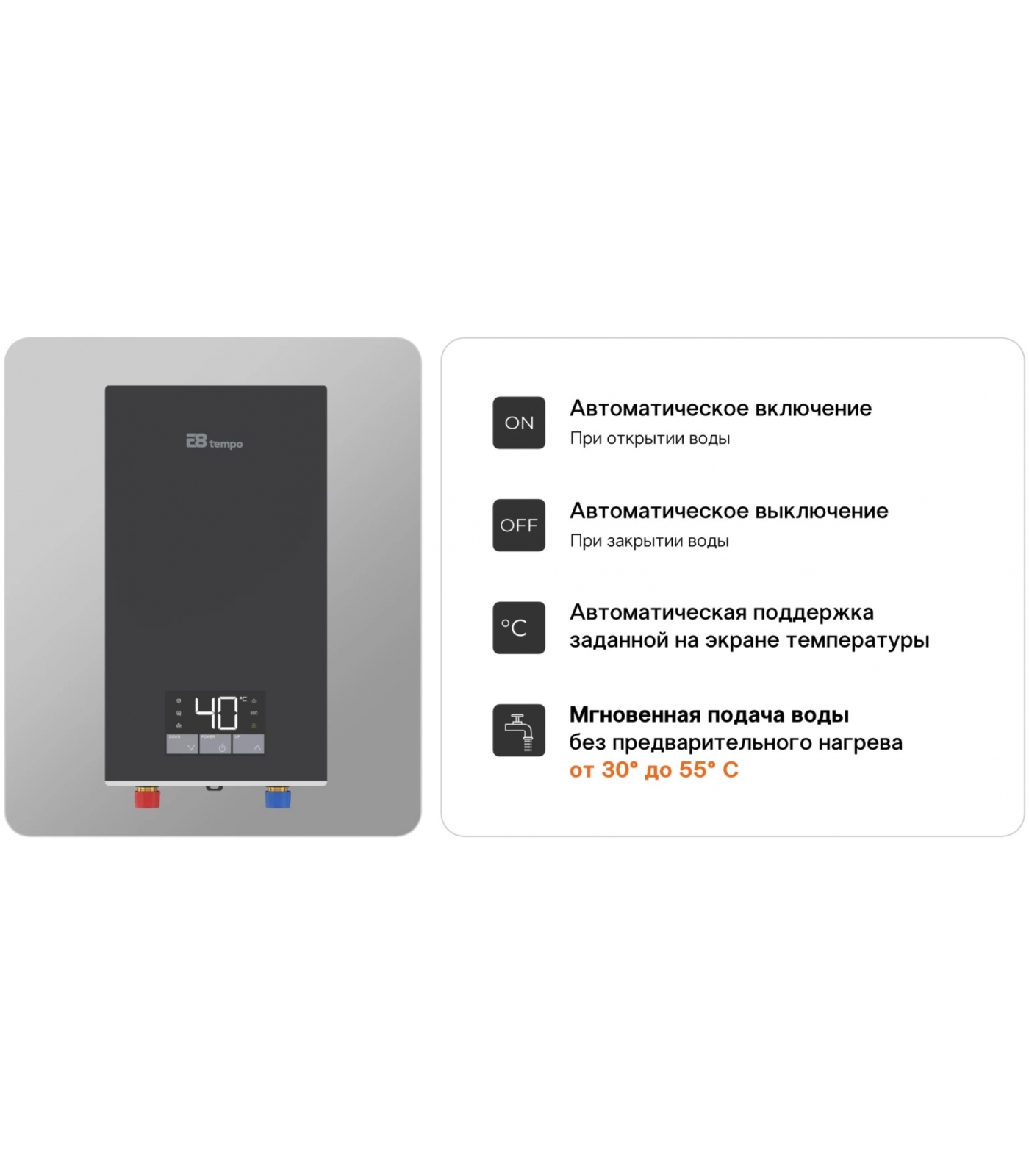 Прибор обеспечивает мгновенную подачу горячей воды. Без предварительного нагрева, без потерь на нагрев в режиме ожидания, энергосбережение.
