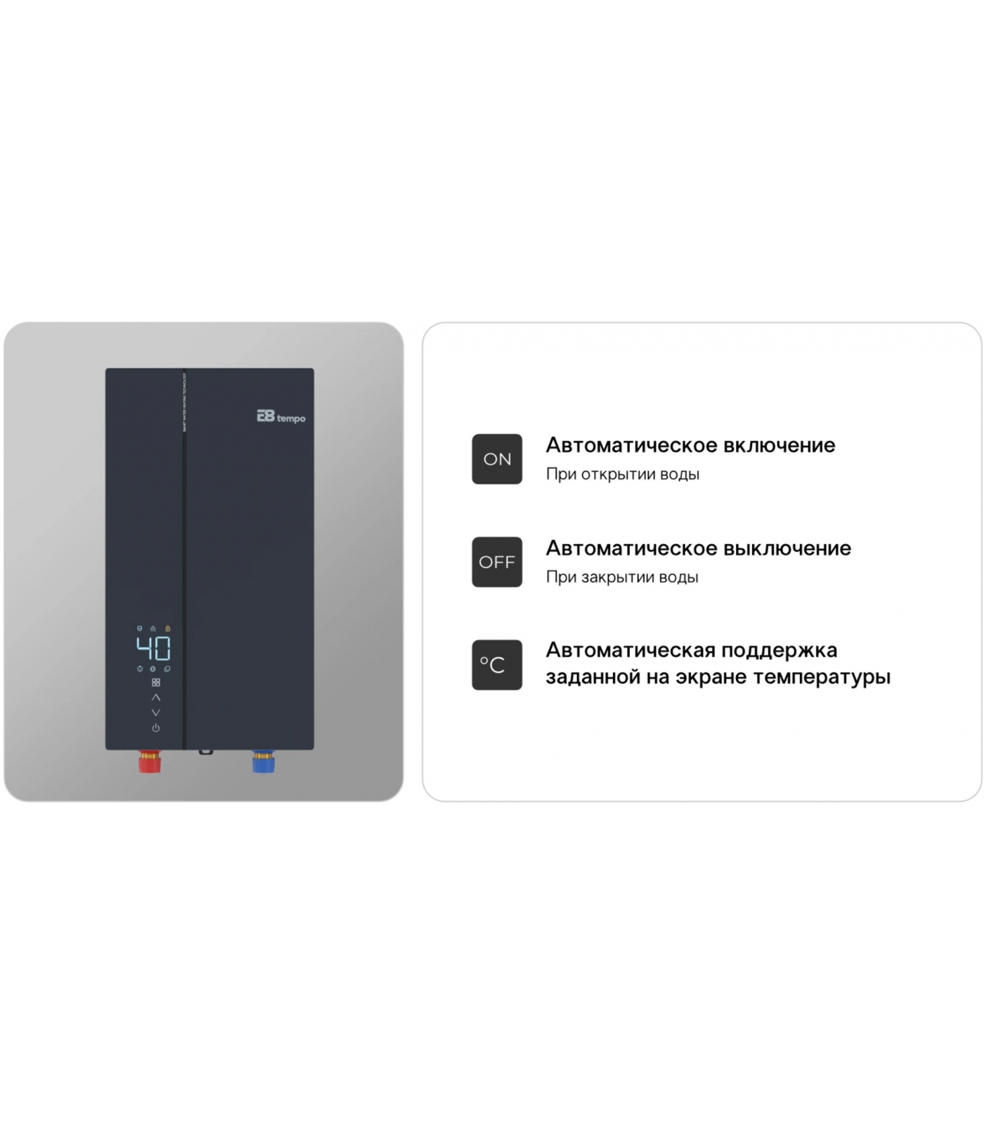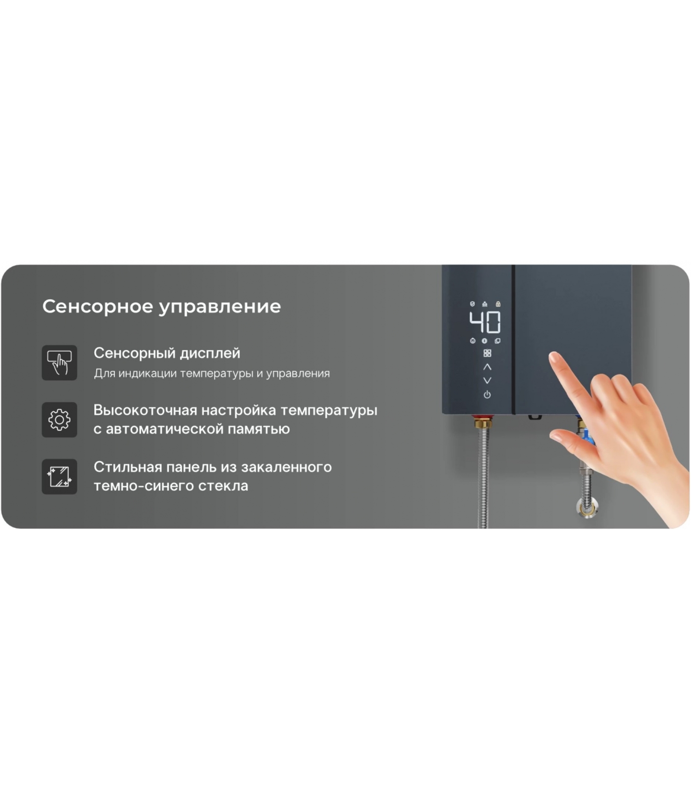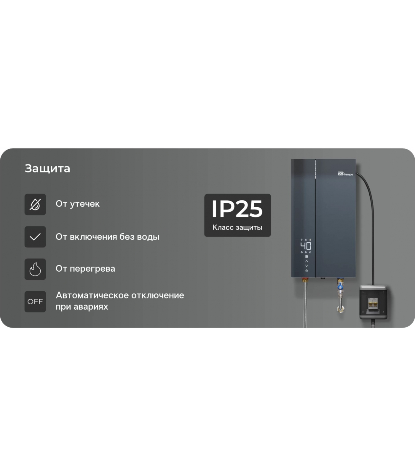 Прибор обеспечивает мгновенную подачу горячей воды. Без предварительного нагрева, без потерь на нагрев в режиме ожидания, энергосбережение.