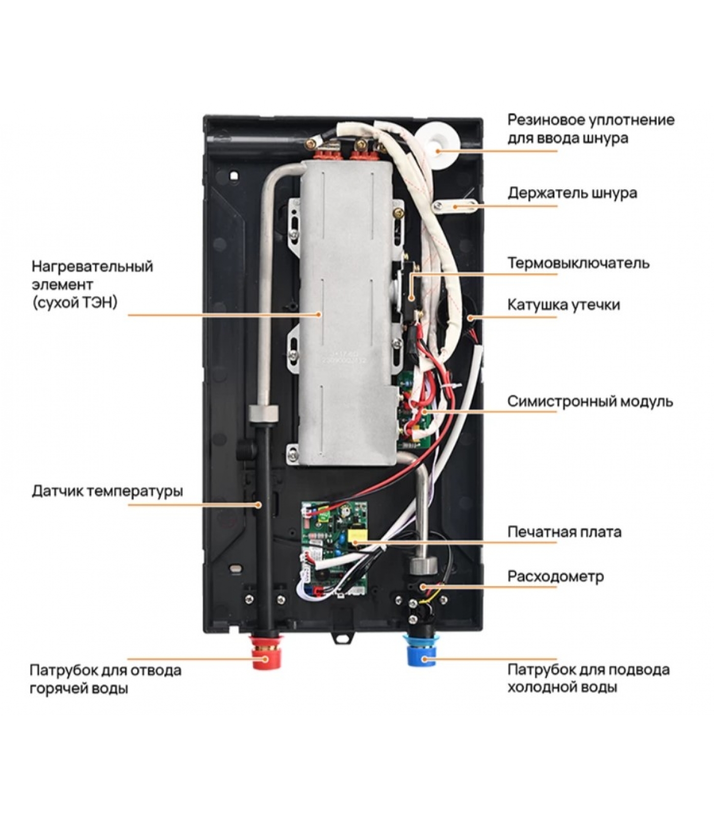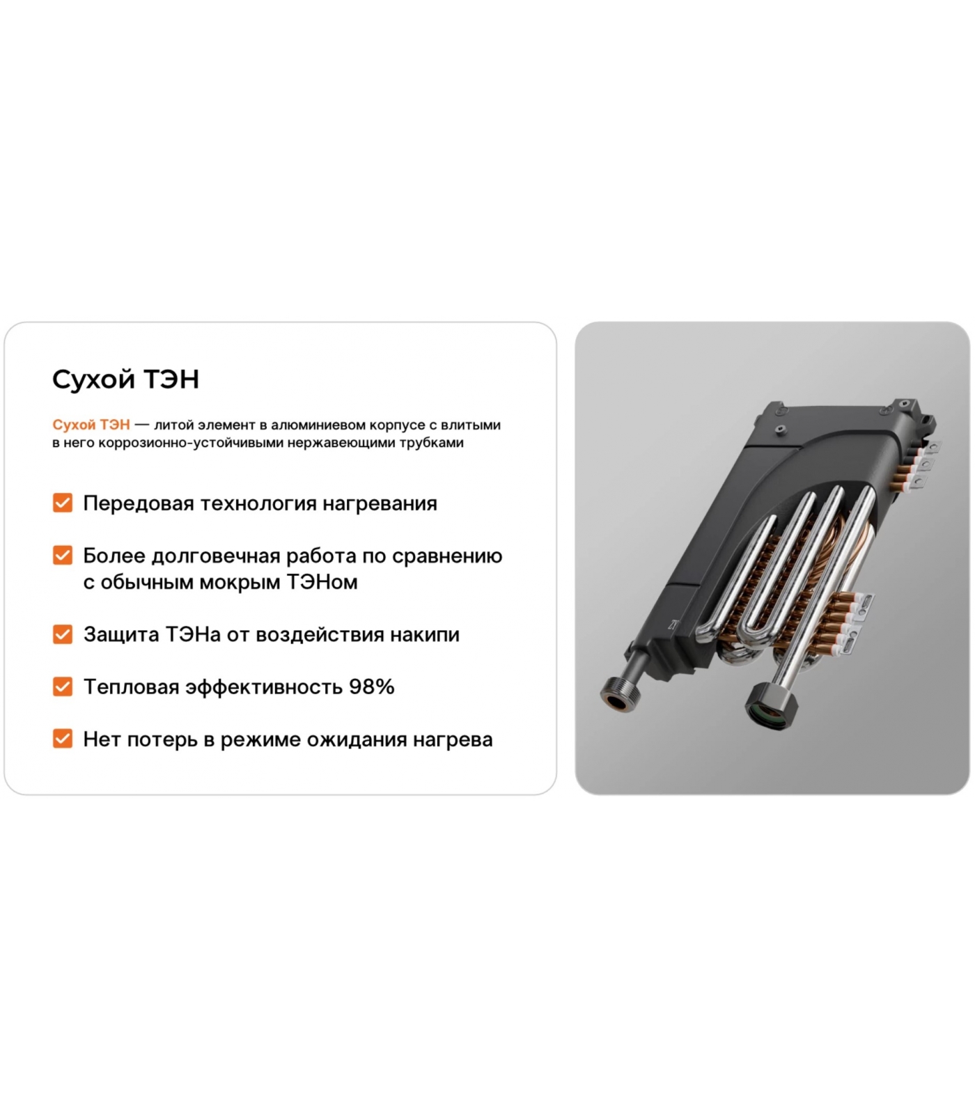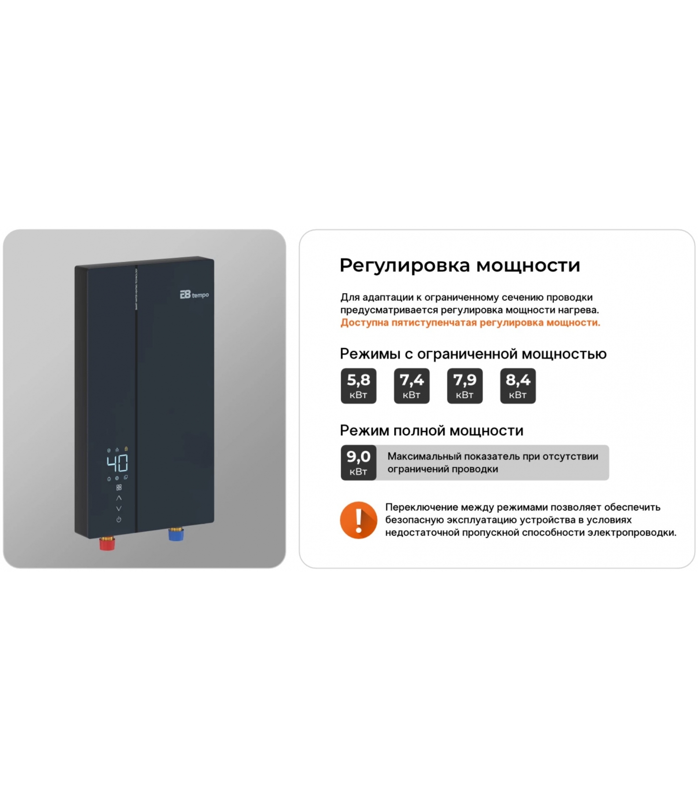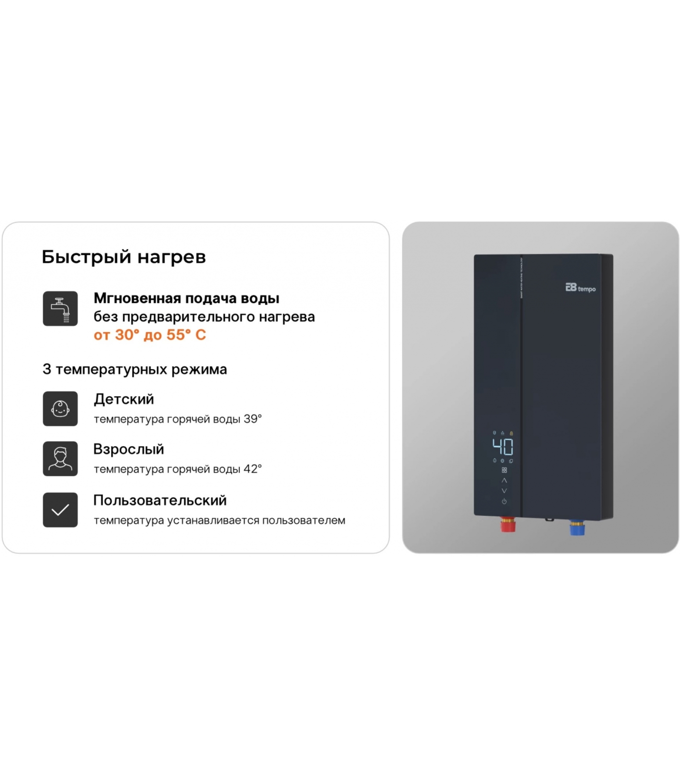 Прибор обеспечивает мгновенную подачу горячей воды. Без предварительного нагрева, без потерь на нагрев в режиме ожидания, энергосбережение.