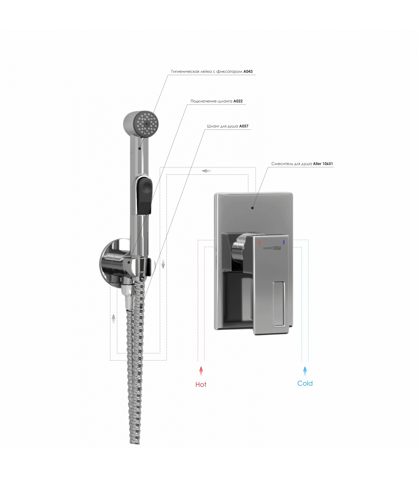 Смеситель для душа Aller 10651, Подключение шланга A022, Шланг для душа 1200 мм А057, Гигиеническая лейка с фиксатором A043