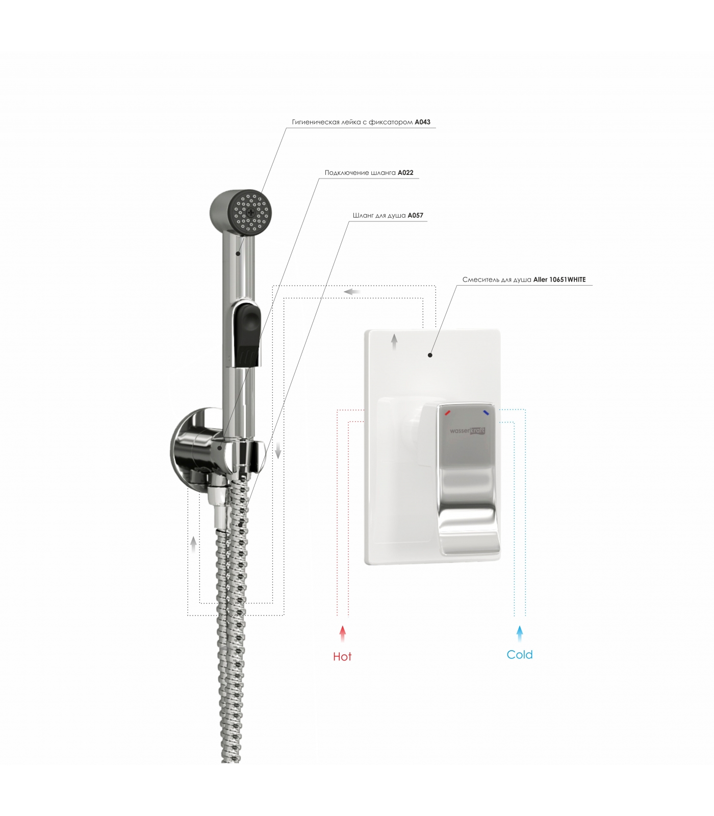 Смеситель для душа Aller 10651WHITE, Подключение шланга A022, Шланг для душа 1200 мм А057, Гигиеническая лейка с фиксатором A043